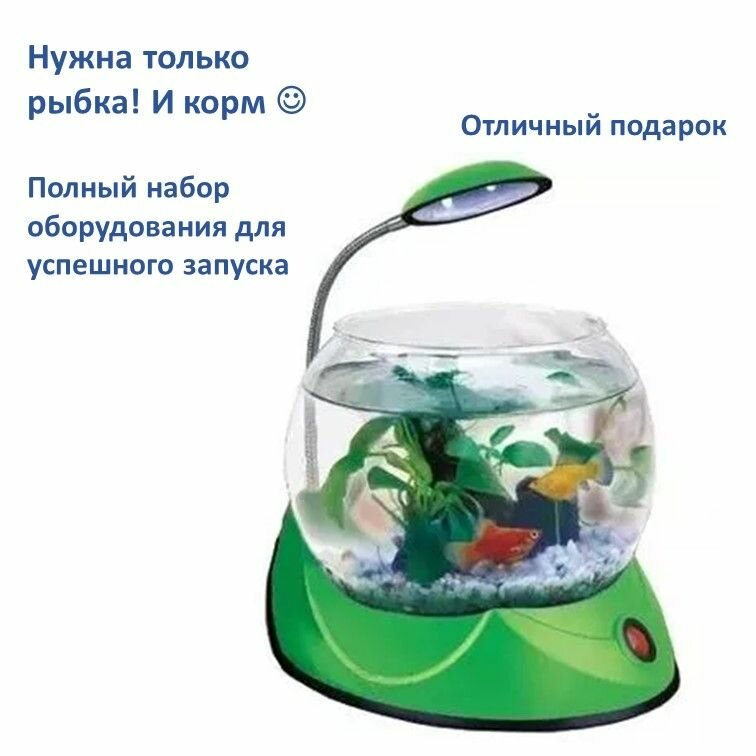 Круглый аквариум для рыбок с LED-подсветкой, растением и грунтом, 2,5 л зеленый интересное: