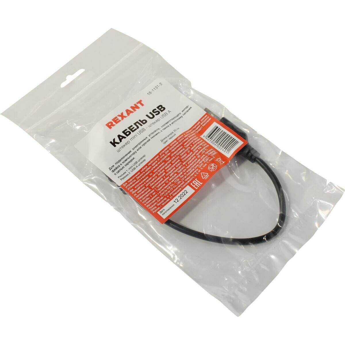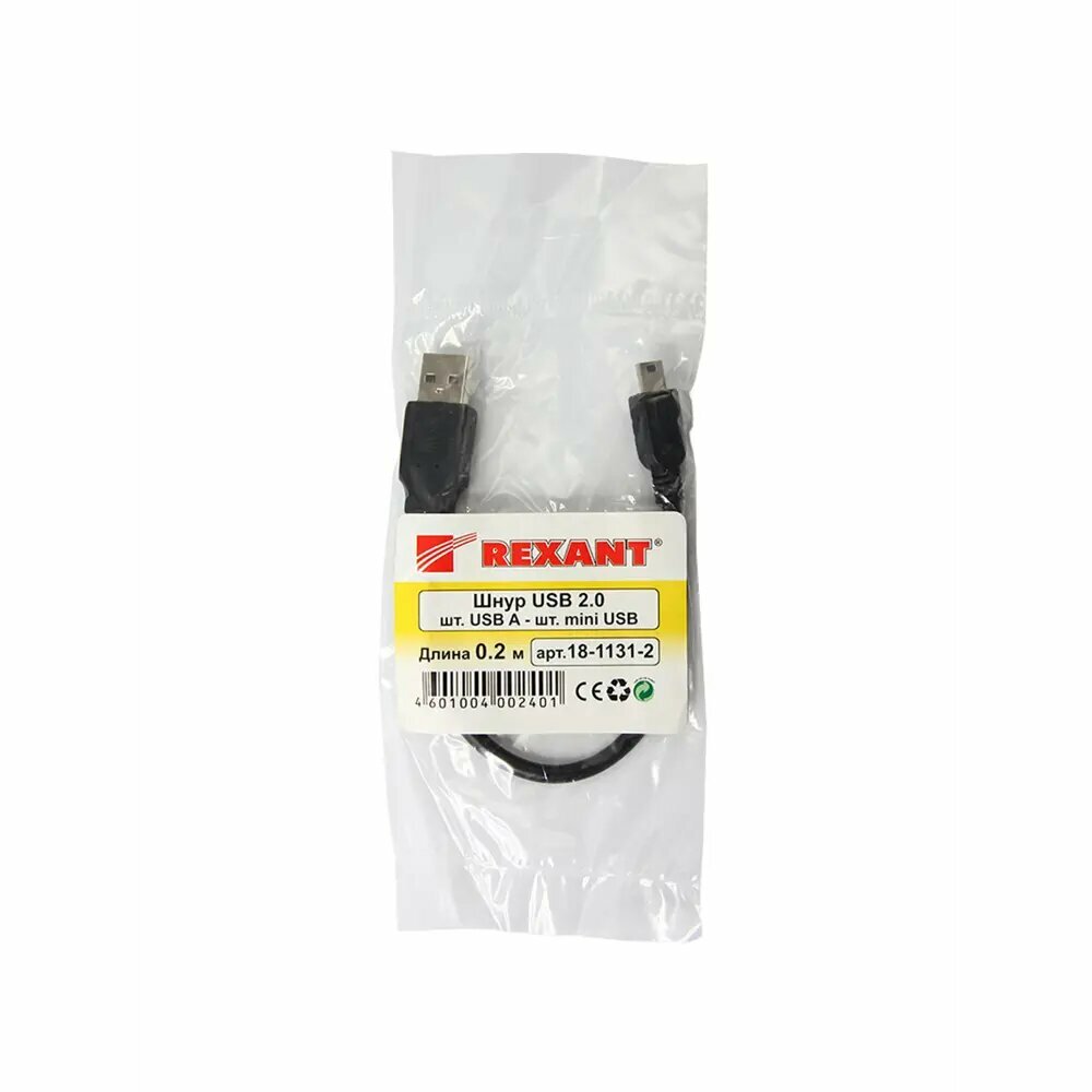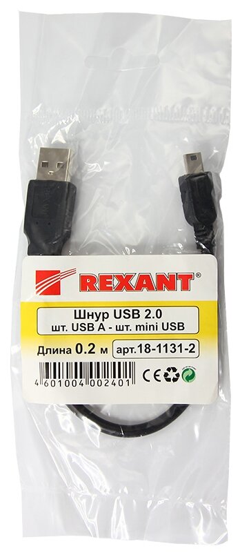 Шнур Rexant, штекер mini USB - штекер USB-A, 0.2 м, черный {18-1131-2}