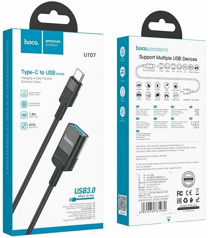 Адаптер переходник Hoco с USB(a) на USB(f) 3.0 U107 1.2m черный