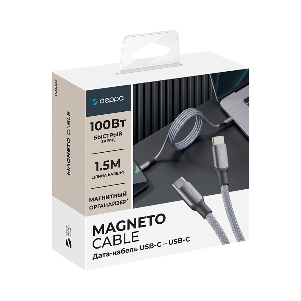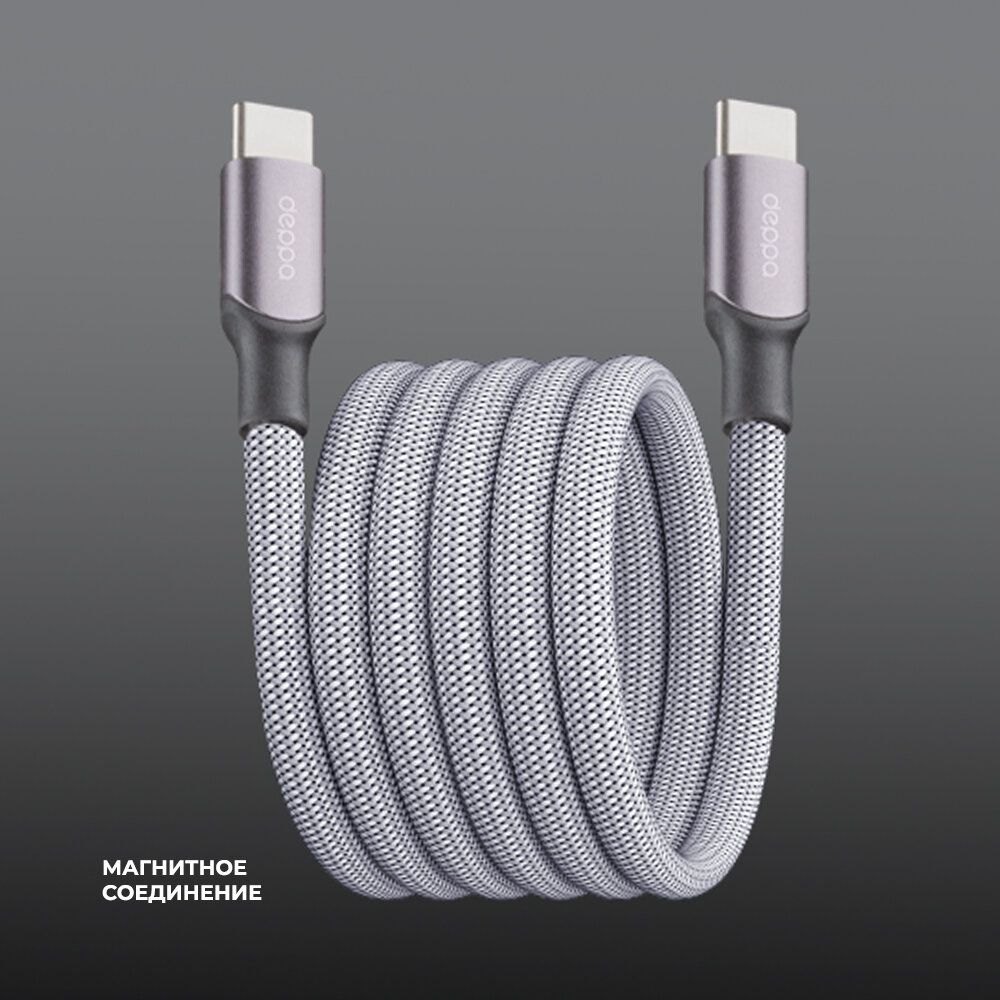 Кабель для зарядки смартфона Magneto, USB-C - USB-C, 100Вт, 1.5м, магнитный, нейлон, серый, Deppa, Deppa 72549