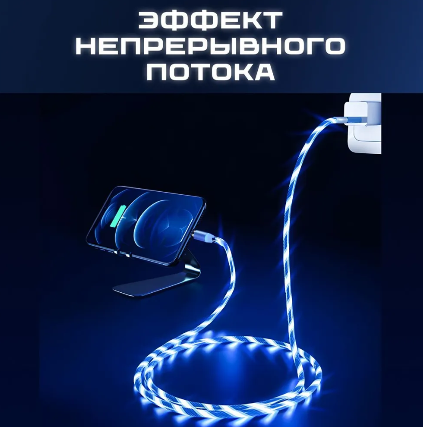 Магнитный светящиеся синий кабель 3в1/Lighting-Type C-Micro USB