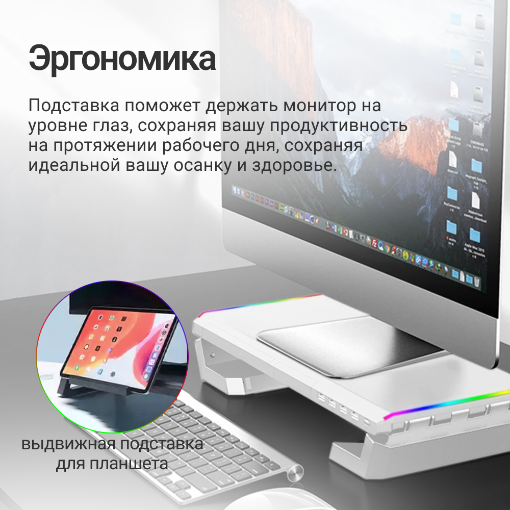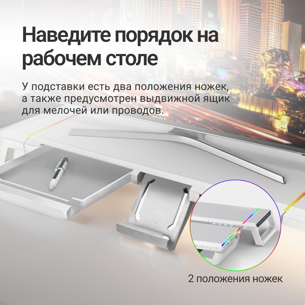 Подставка для монитора настольная складная / органайзер полка под монитор для компьютера с RGB подсветкой USB, с выдвижными ящиками для смартфона