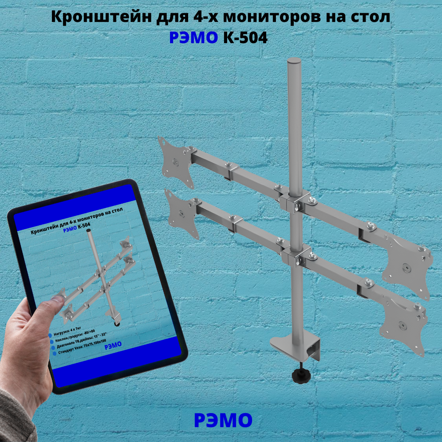 Купить Кронштейн для четырех мониторов на стол наклонно-поворотный с диагональю от 15"до 32" Рэмо К-504,металлик
