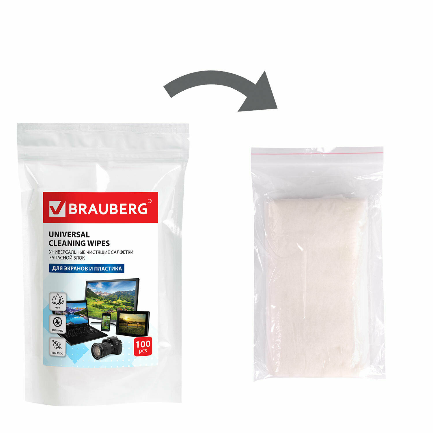Чистящие салфетки для экранов и пластика (запасной блок) BRAUBERG, 100 шт., влажные, 511685