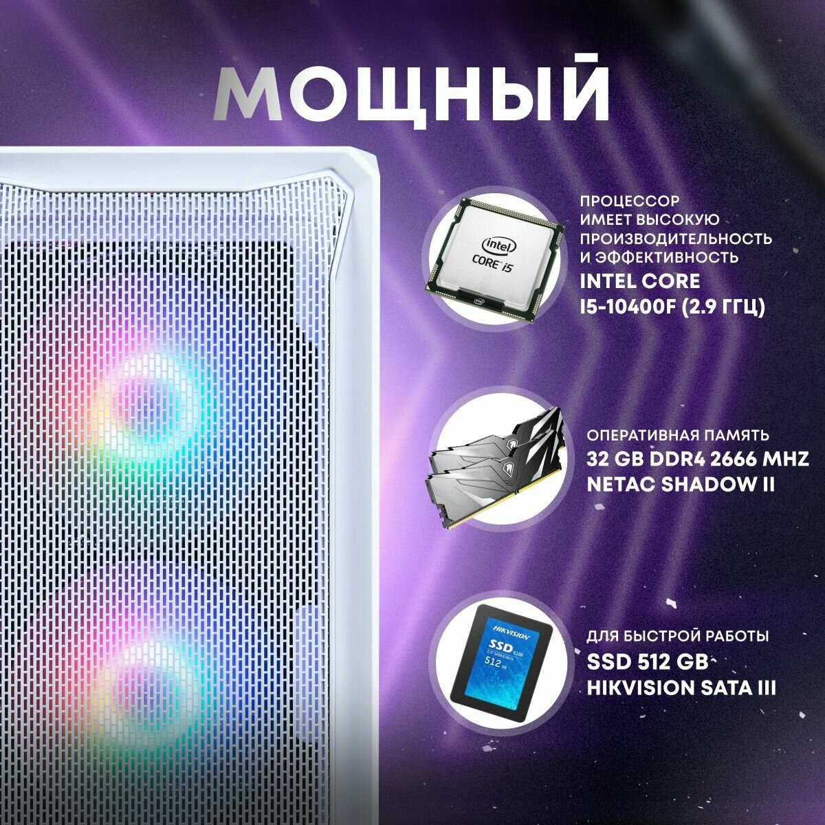 Системный блок игровой мощный для компьютера ПК (intel CORE i5 10400F, GTX 1650 4ГБ, ОЗУ 32ГБ, SSD 512GB)