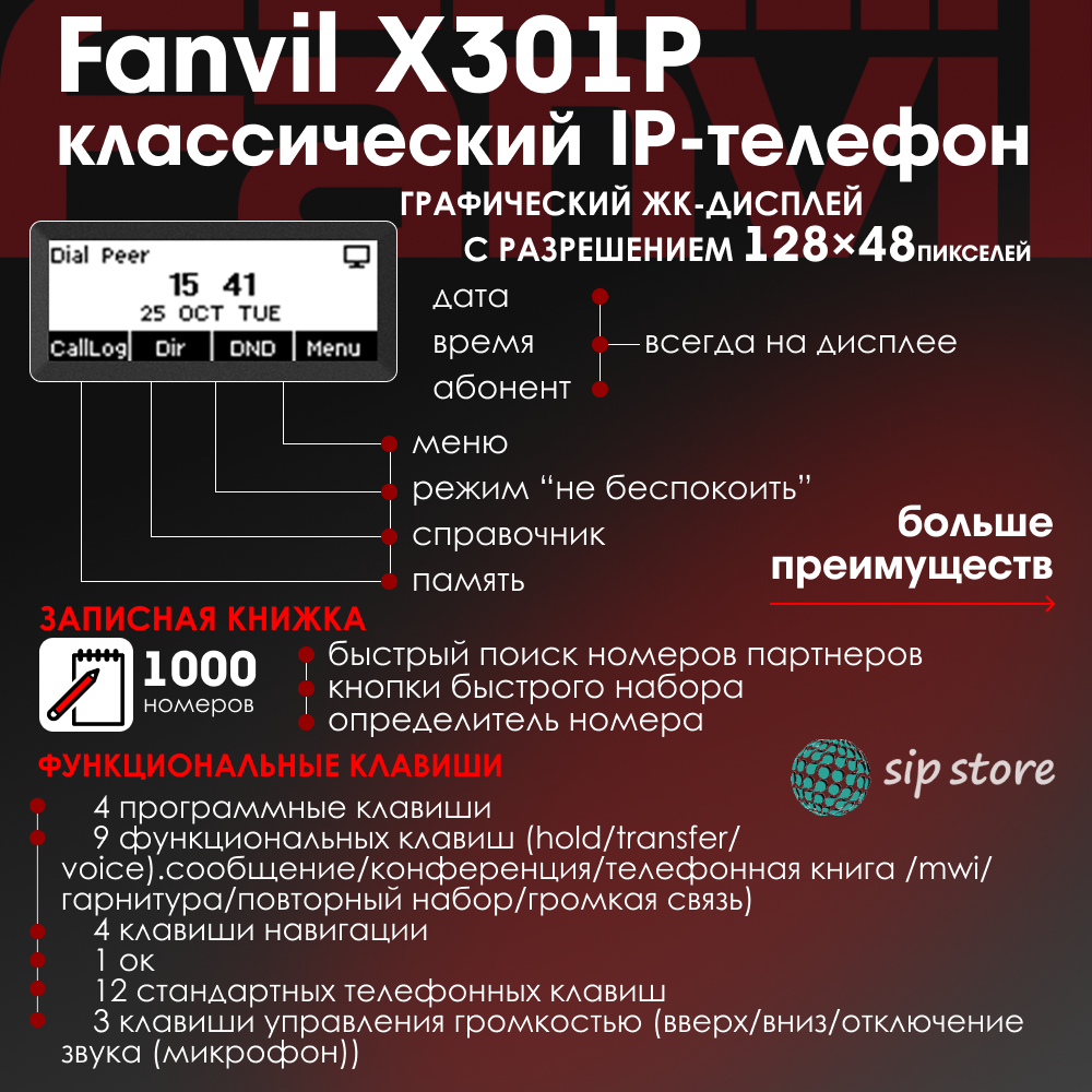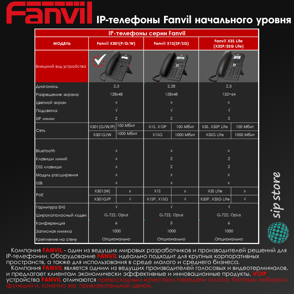 IP-телефон Fanvil X301P, 2 SIP аккаунта, монохромный 2,3 дюйма дисплей 128x48, конференция на 6 абонентов, поддержка EHS, POE, 1000 Mbps. интересное: