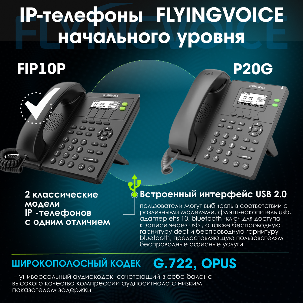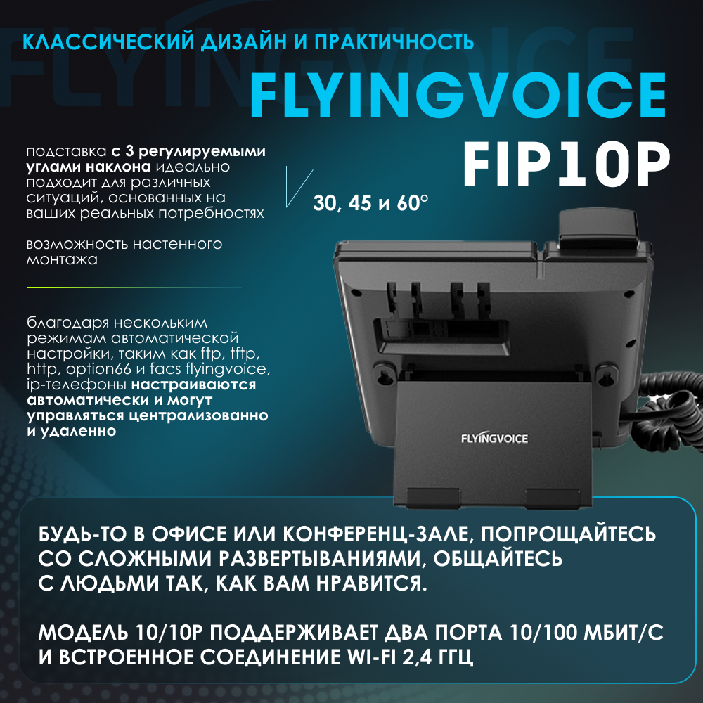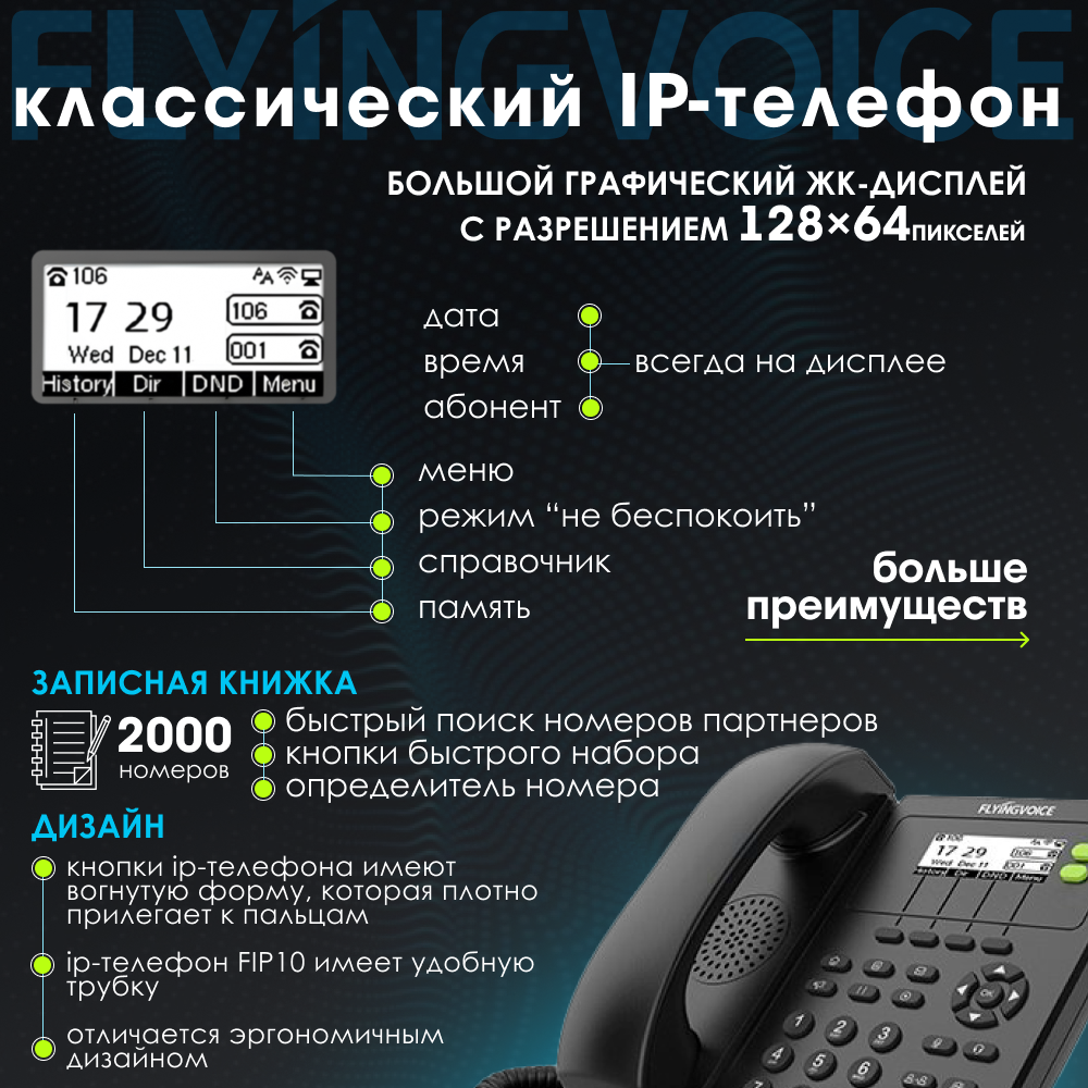 IP-телефон FLYINGVOICE FIP10P, 2 SIP аккаунта, монохромный дисплей 128 x 64 с подсветкой, конференция на 3 абонента, поддержка EHS, POE и Wi-Fi. интересное: