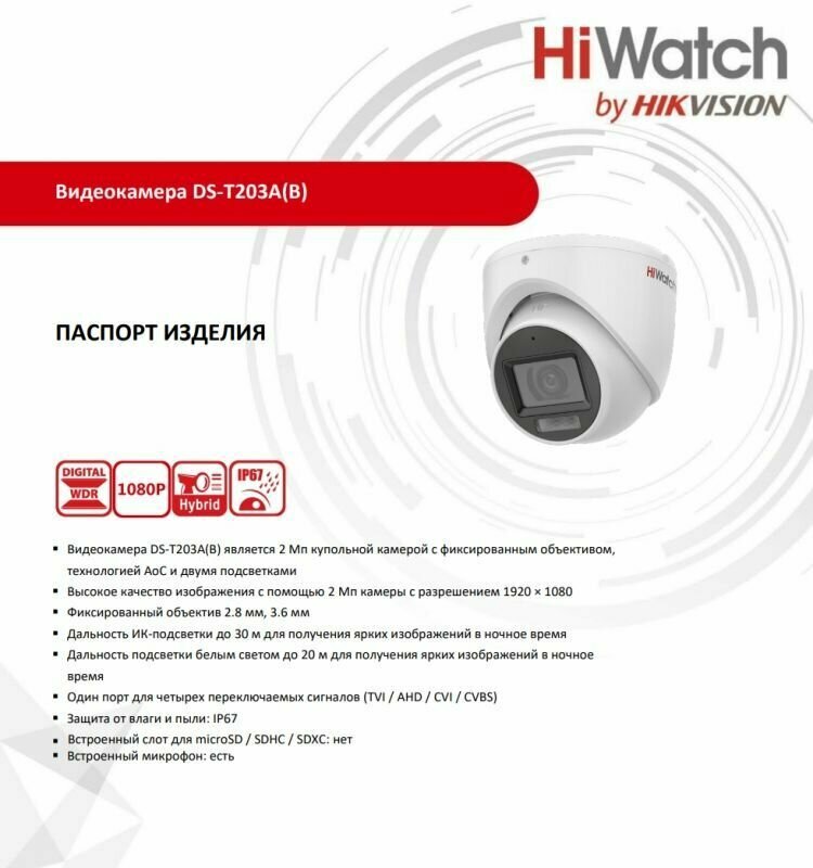 Камера видеонаблюдения HiWatch DS-T203A(B) (2.8мм) мультиформатная уличная 2 Мп купольная HD-TVI видеокамера с EXIR-подсветкой до 30 м и микрофоном интересное: