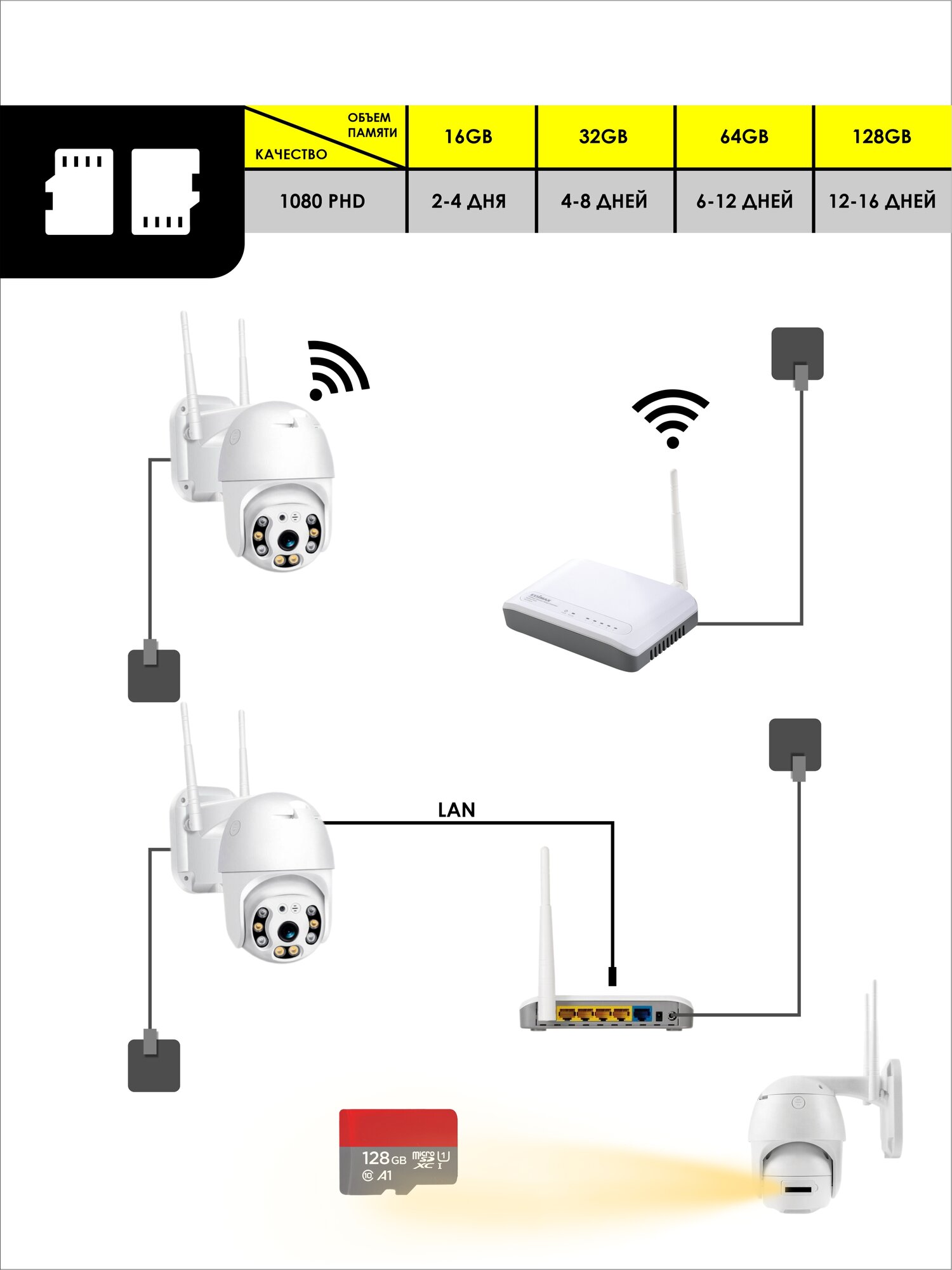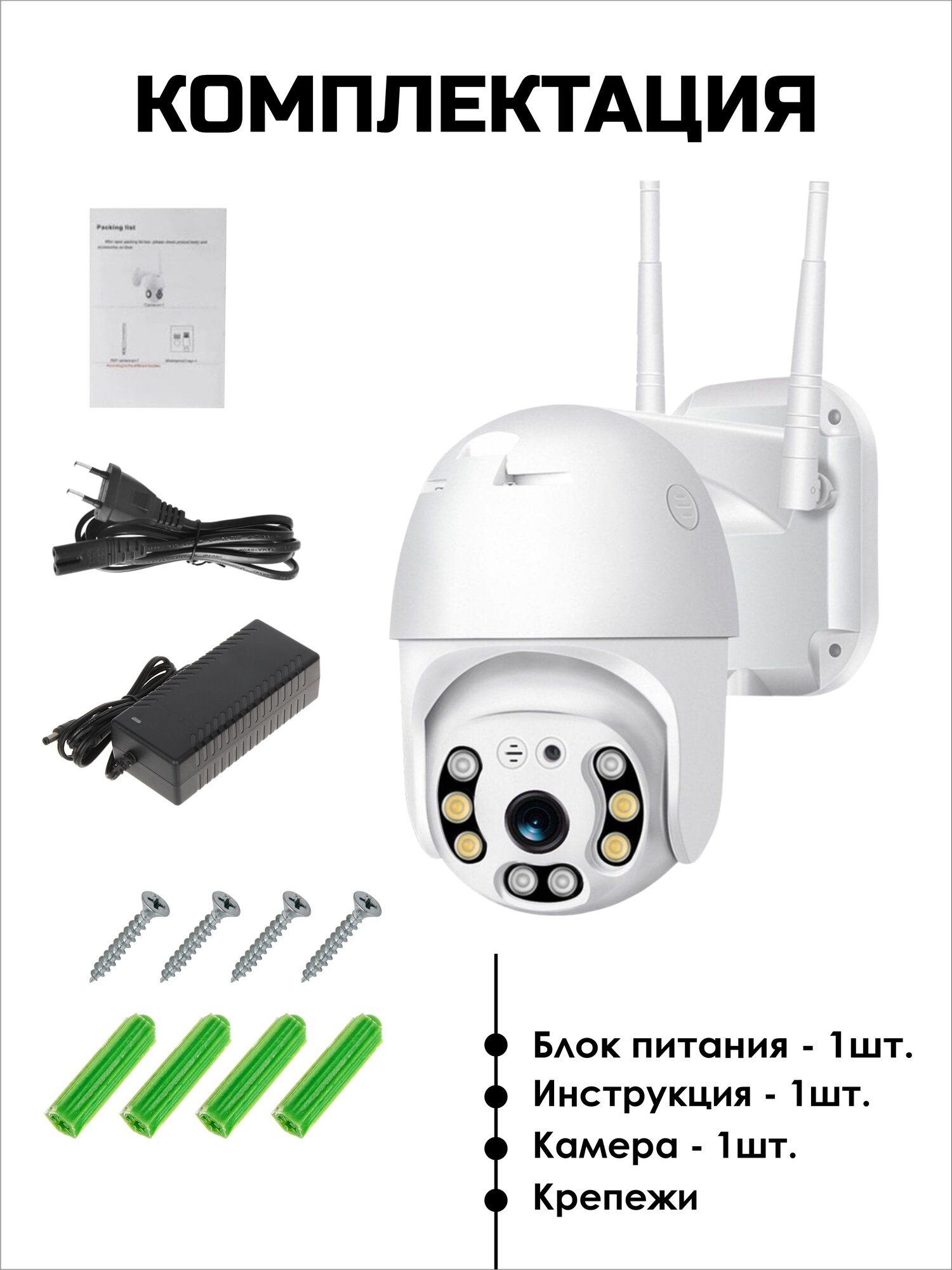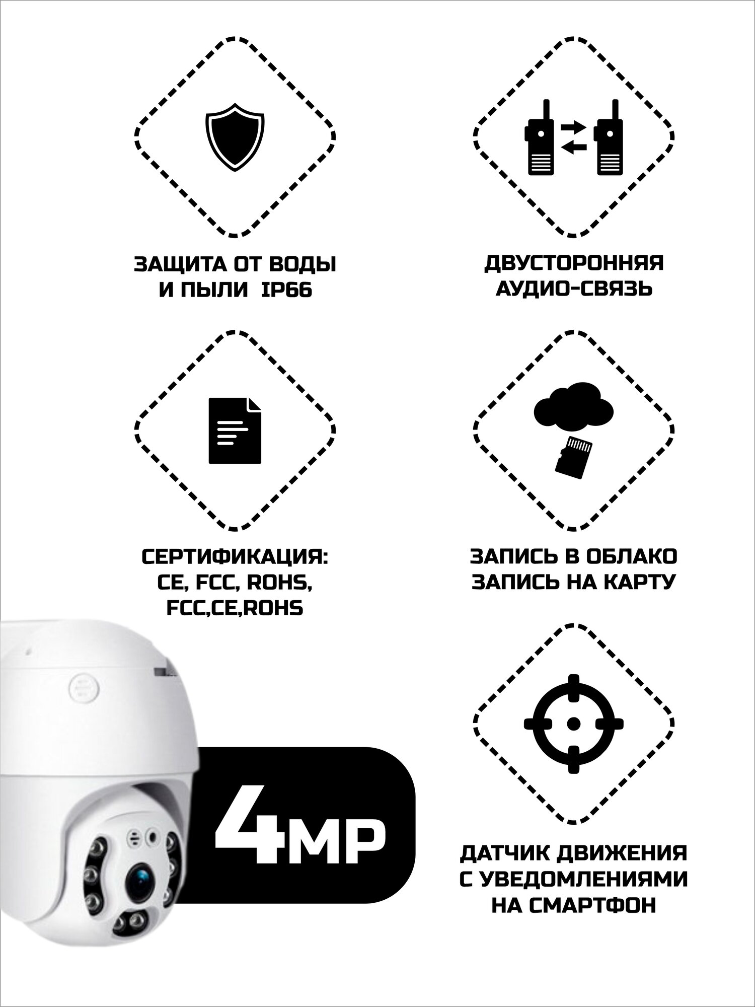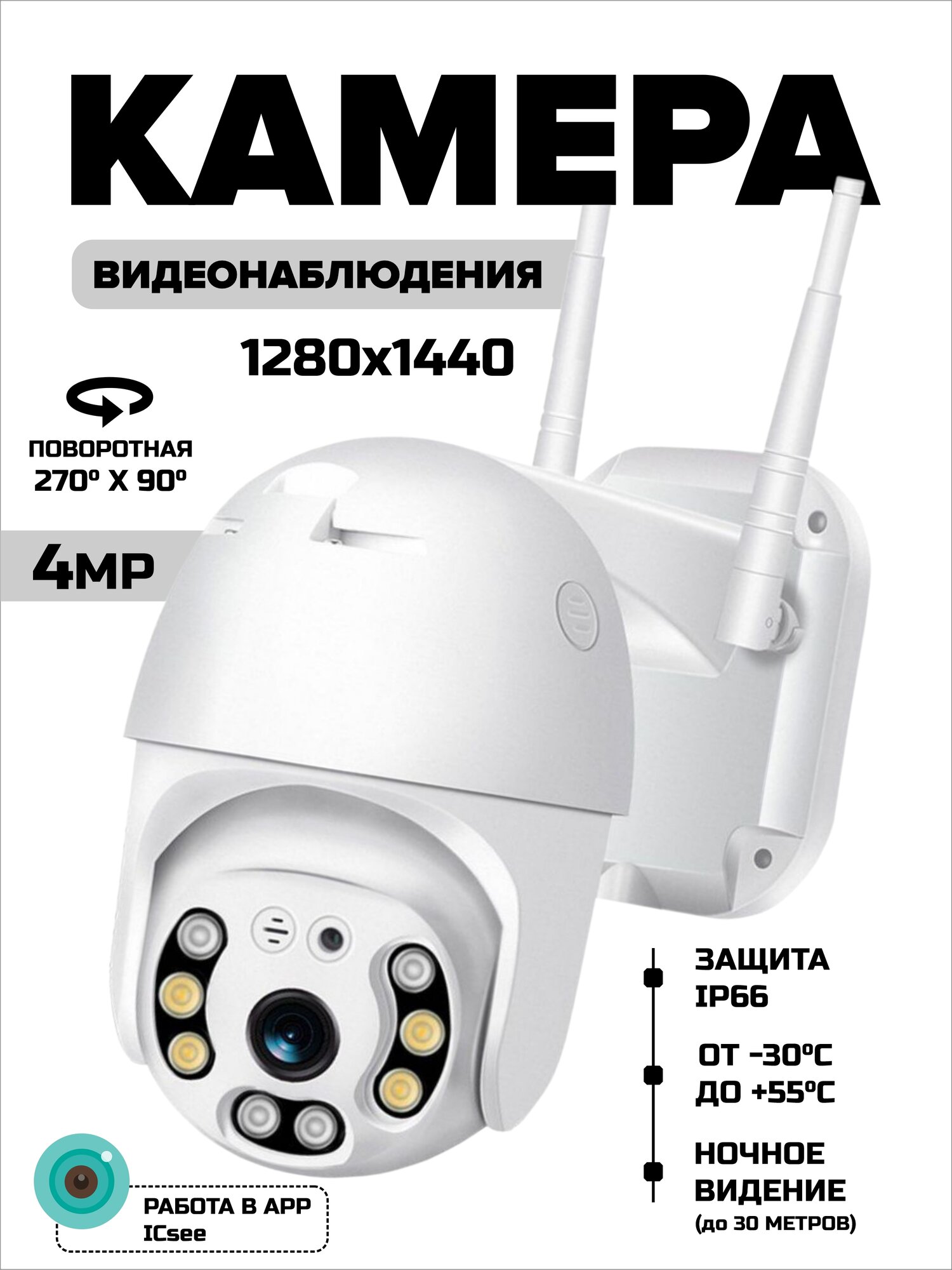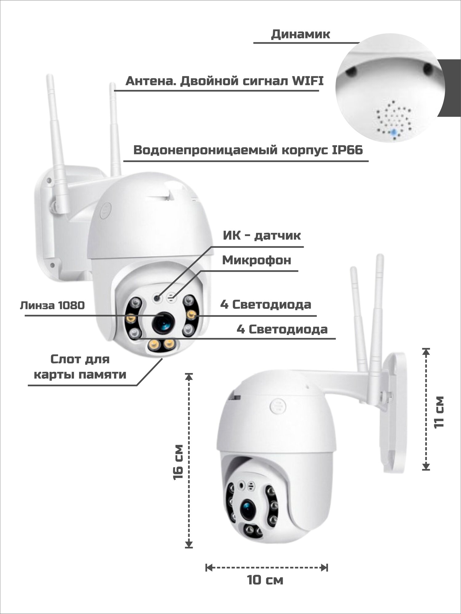 | Дополнительная информация | динамик, микрофон, двойной сигнал wifi, слот для карты памяти (карта памяти в комплекте), линза1080 |