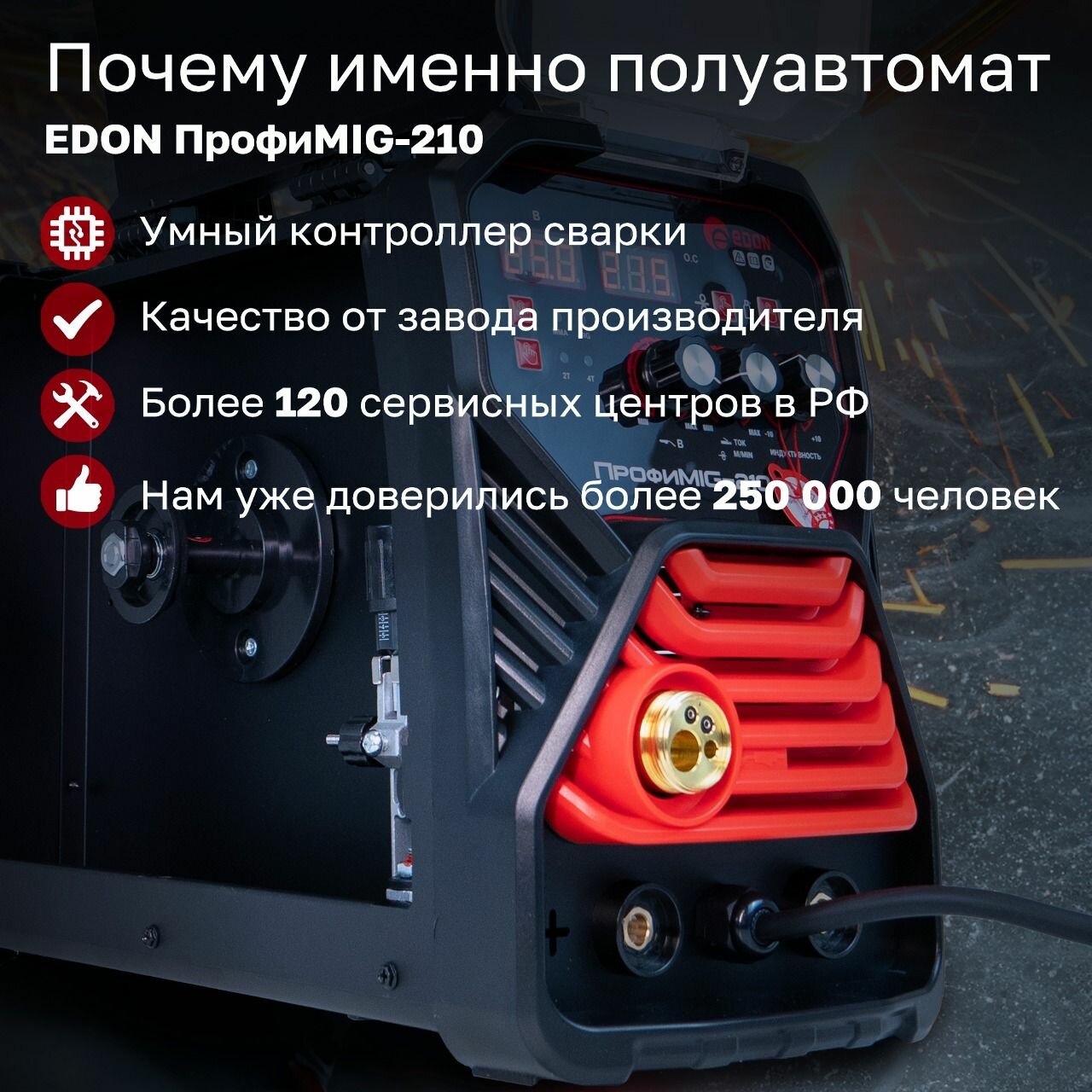 Ниже Вы можете прочитать отзывы на Сварочный аппарат полуавтоматический Edon ПрофиMIG-210 MIG 8,3кВт 20-210А, ознакомится с подробными характеристиками, посмотреть интересные обзоры и фотографии на Сварочный аппарат полуавтоматический Edon ПрофиMIG-210 MIG 8,3кВт 20-210А.