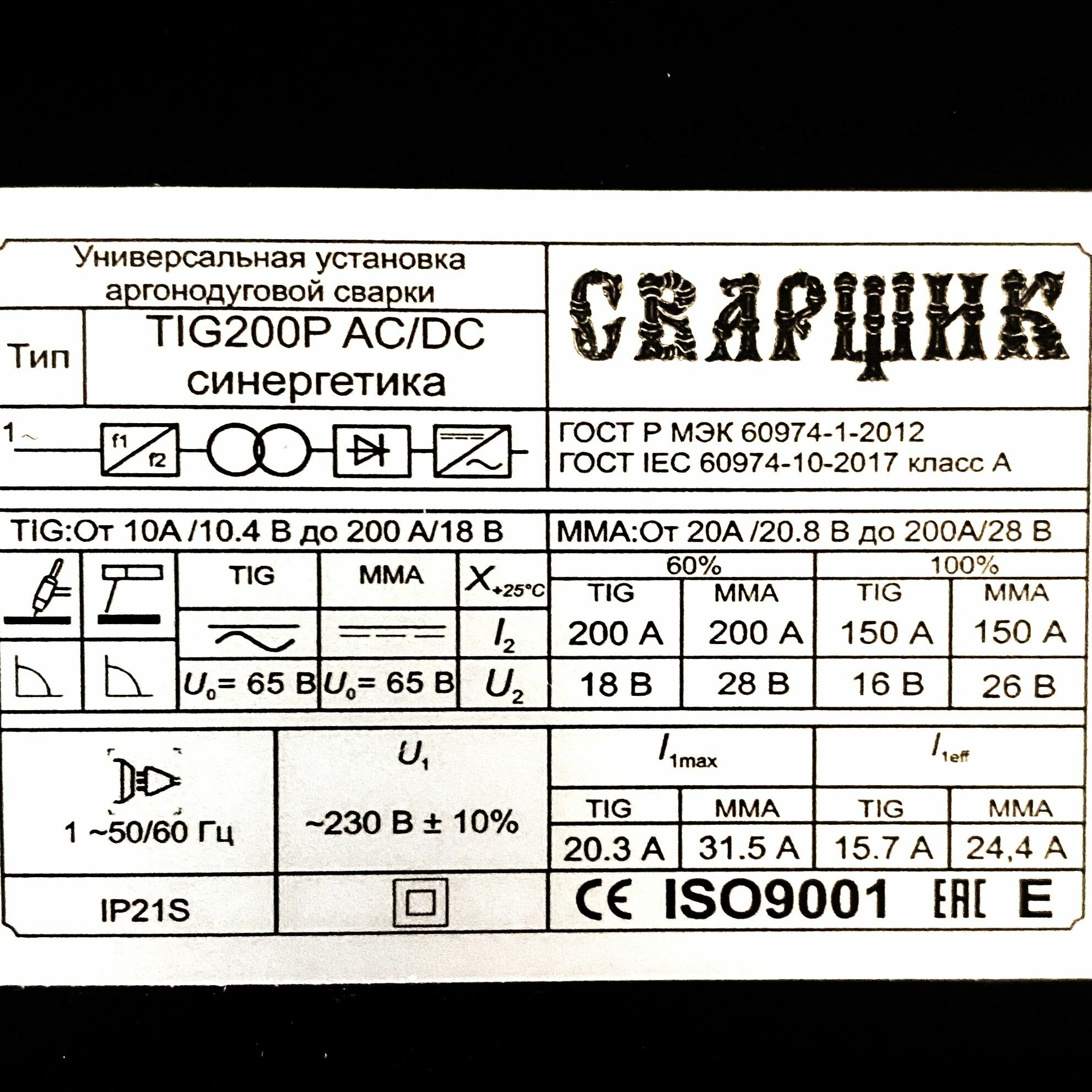 | Макс. сварочный ток при непрерывной работе | 200 А |