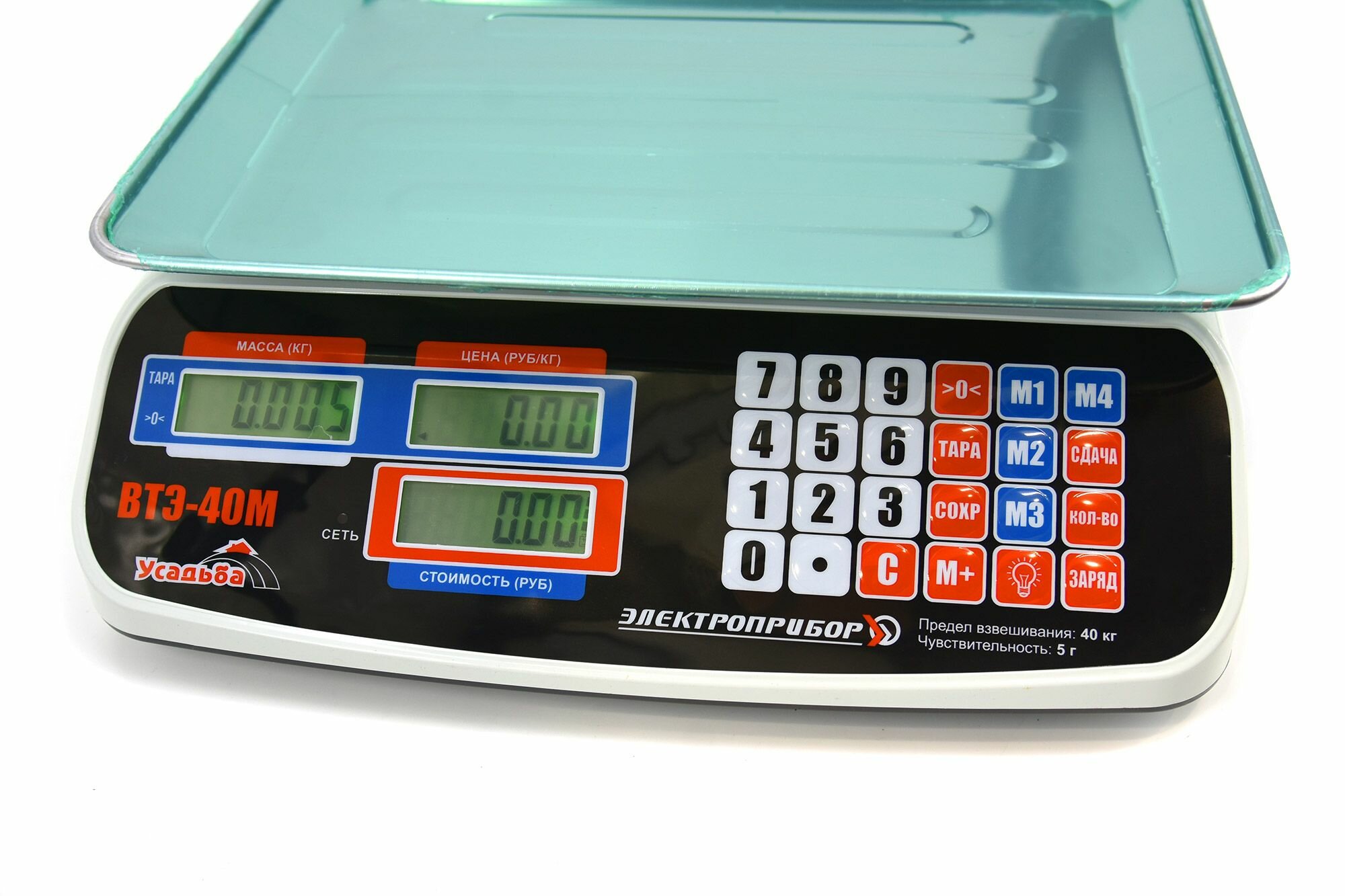 Весы торговые электроприбор Усадьба ВТЭ-40М, До 40 кг, стол 33,/24см, чувств. 5гр,220В, внутр. источник питания 4В, цифры на диспл. вес/цена/общ. цена 5/5/6