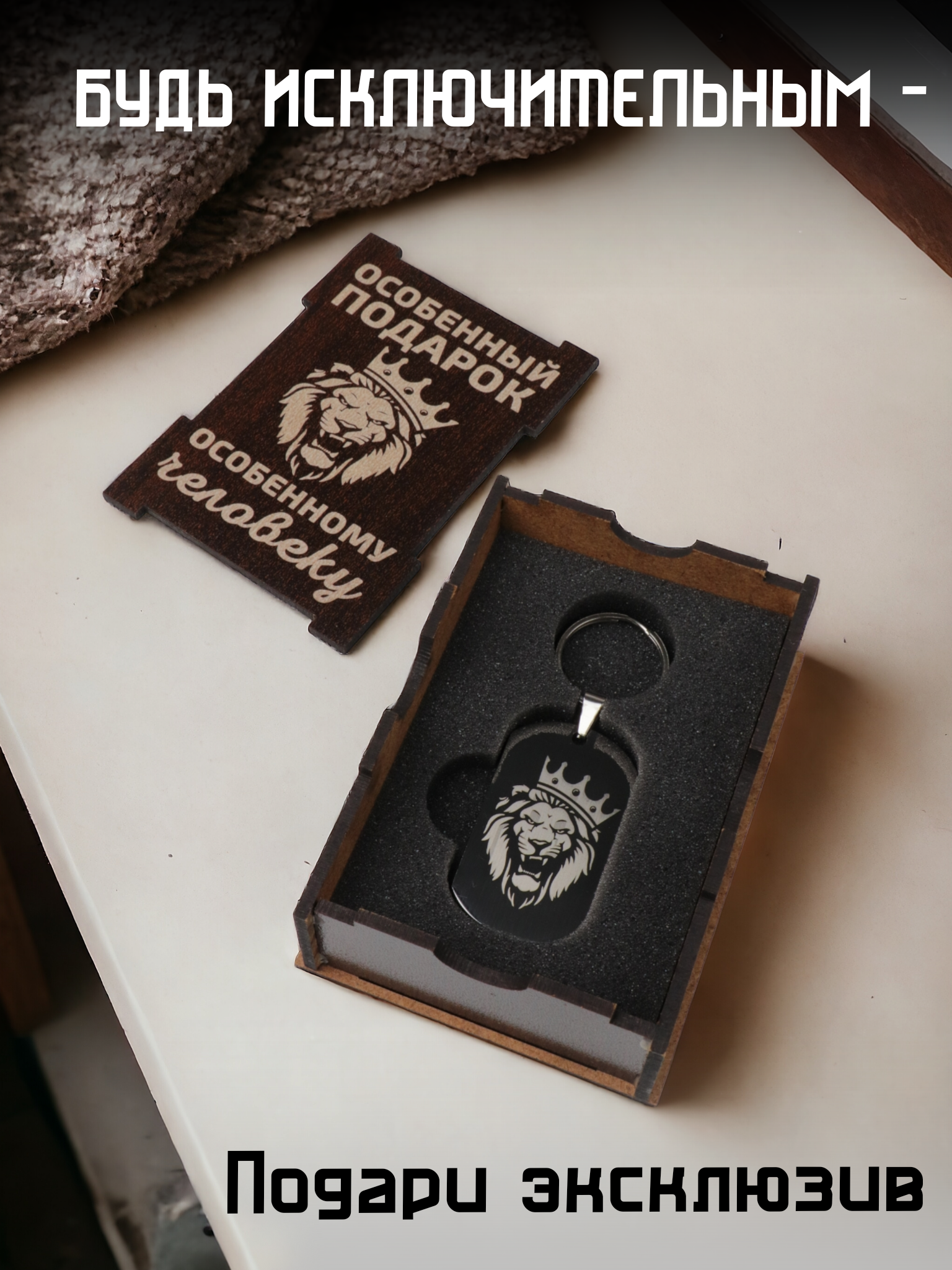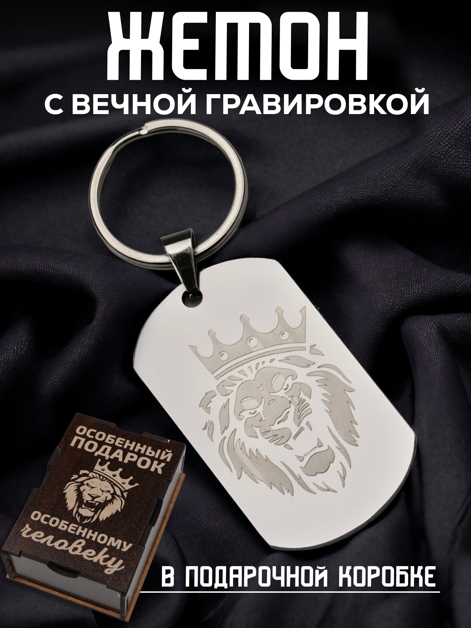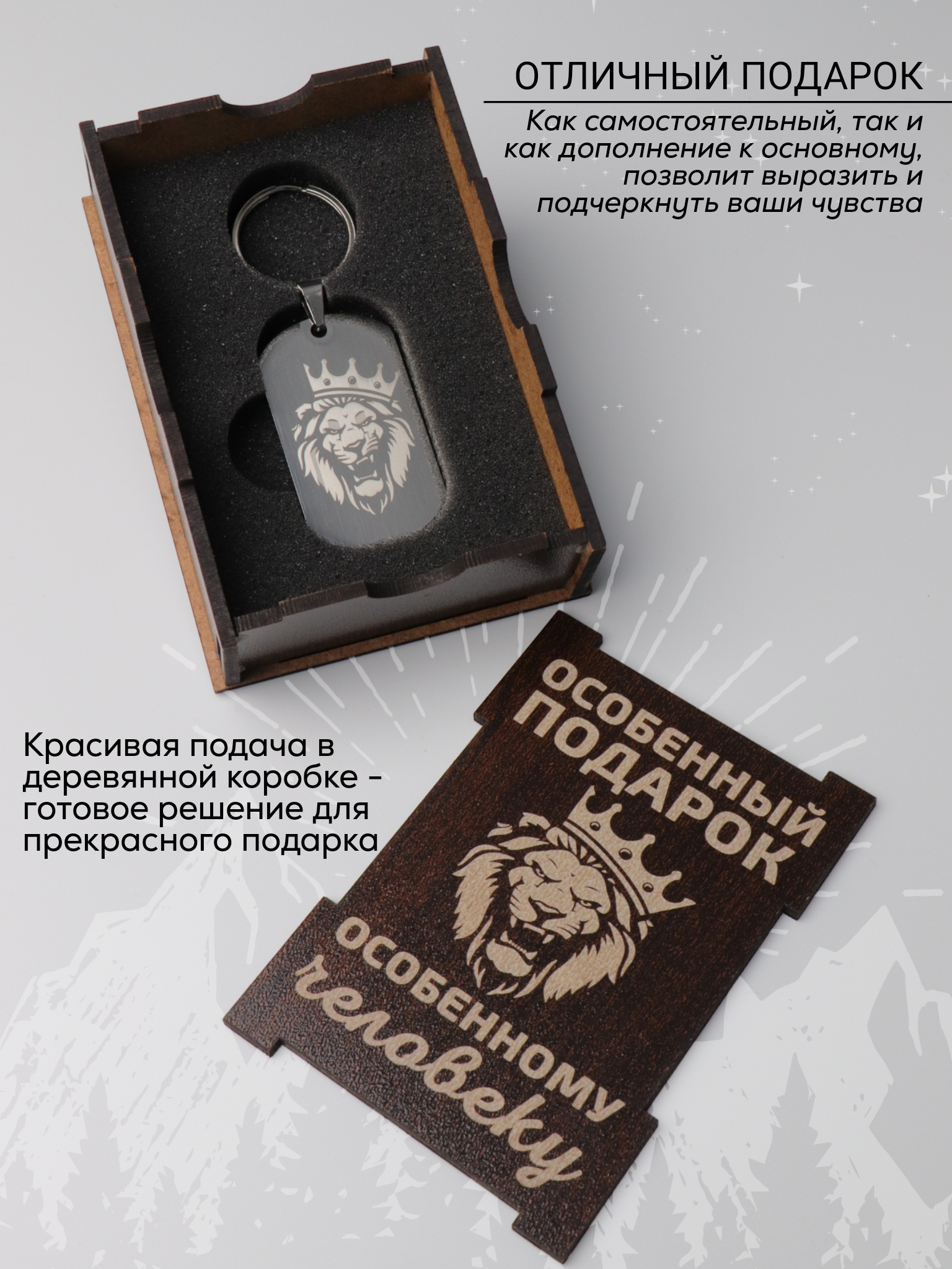 | Подробная комплектация | Подарочная деревянная коробка, металлический жетон с гравировкой, открытка |