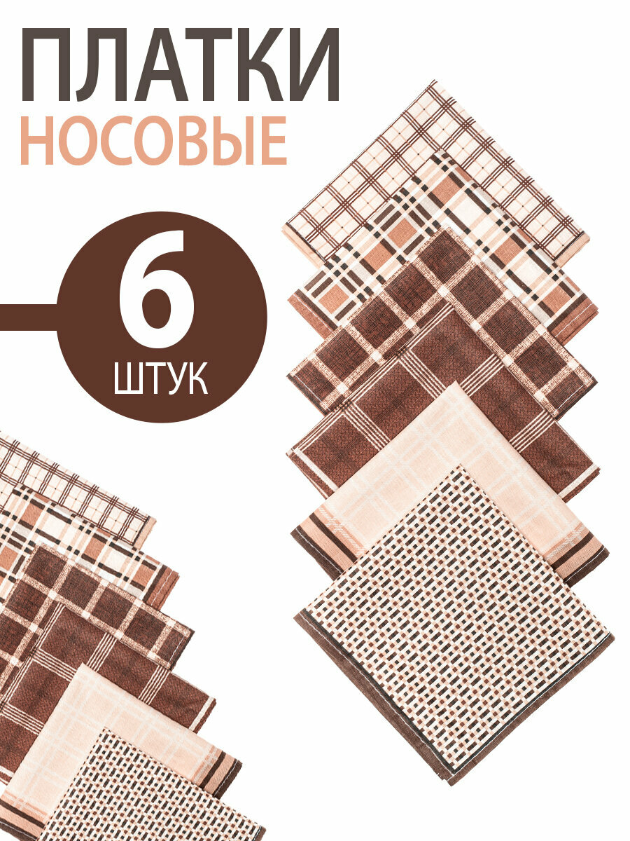 Носовой платок, хлопок, в клетку, для мужчин, 6 шт., коричневый, бежевый