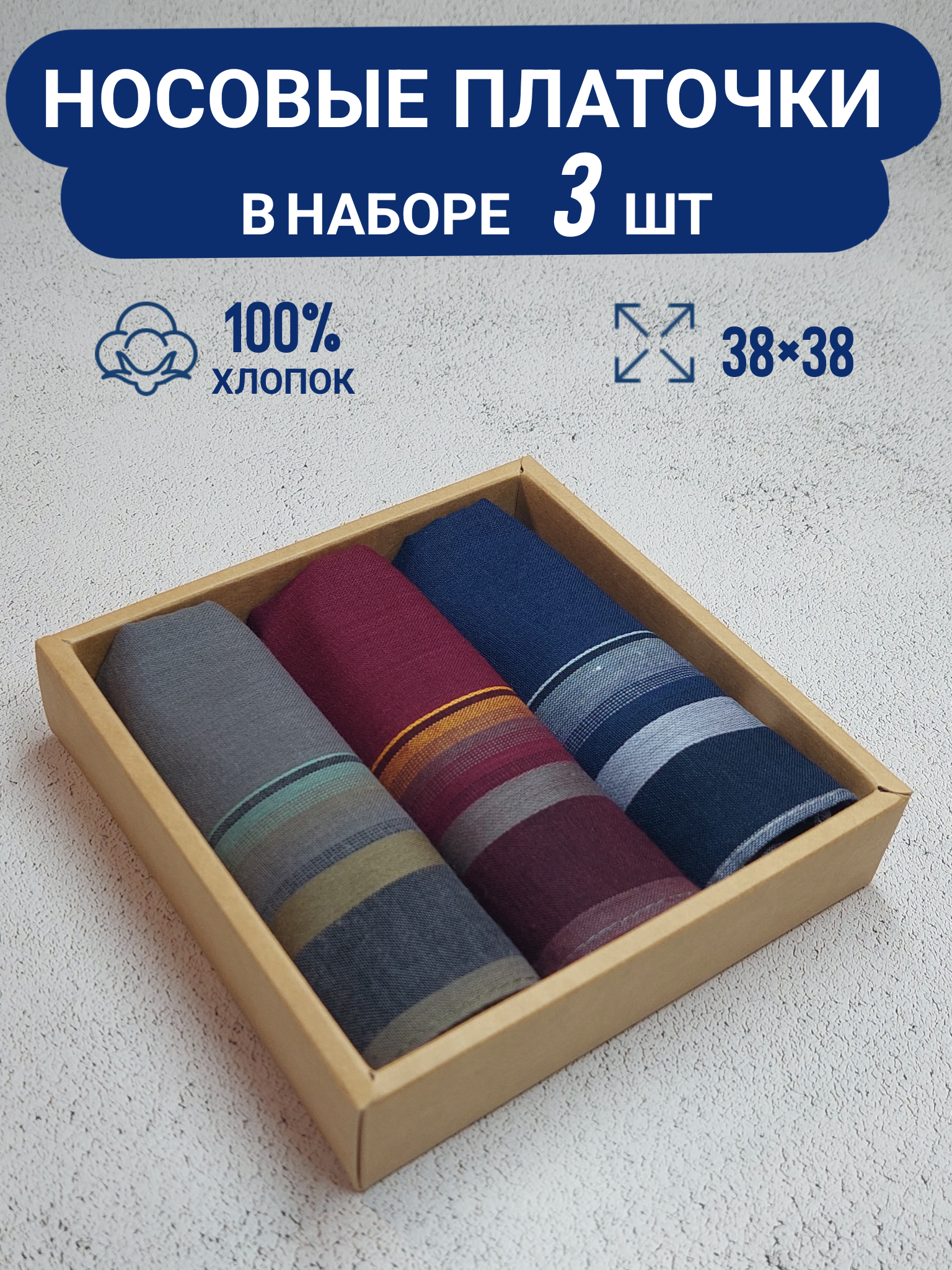 | Подробная комплектация | Носовые платки 3шт., коробка, пакет |