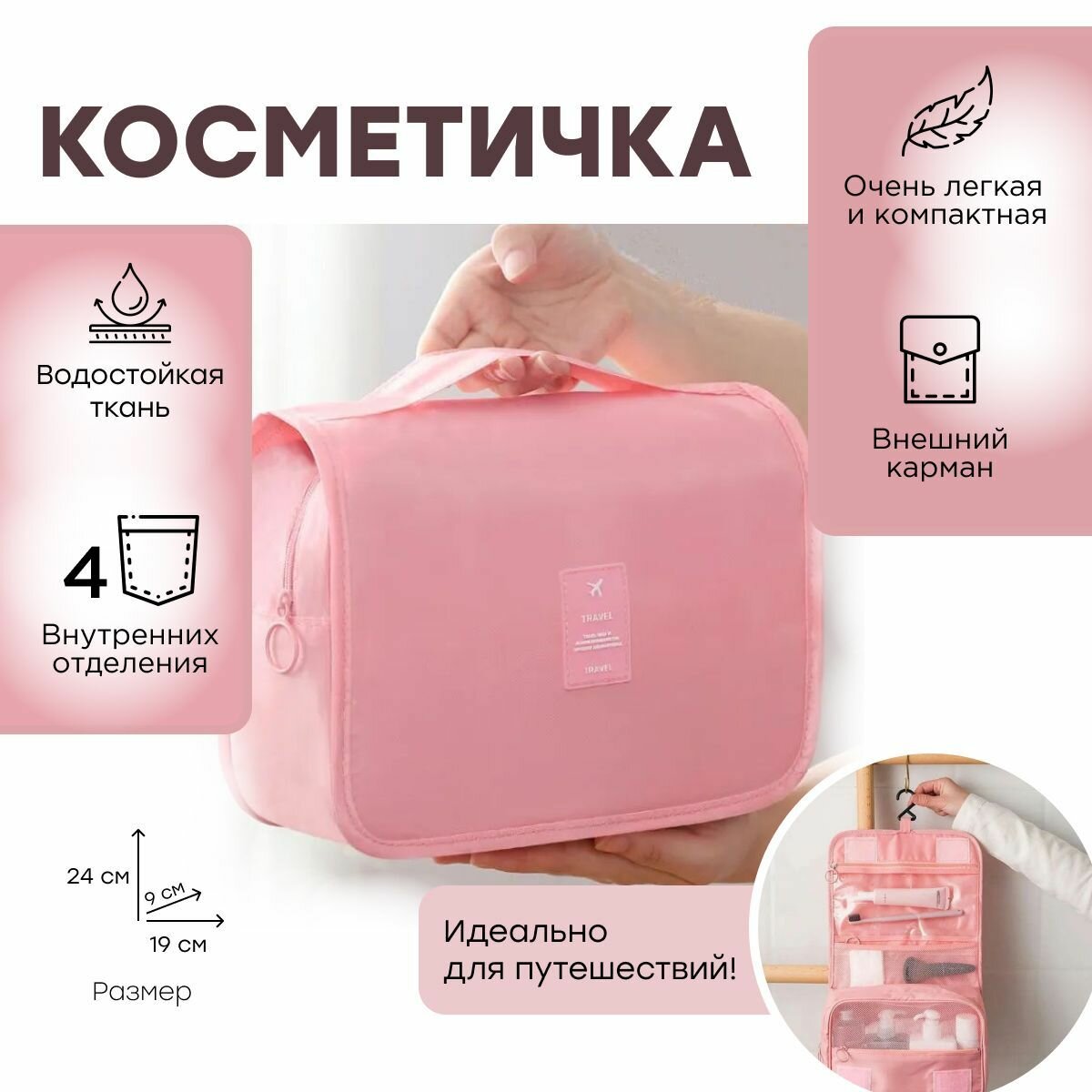 Купить Косметичка TRAVEL на молнии, 10х18х24 см, ручки для переноски, крючок для подвешивания, водонепроницаемая, розовая