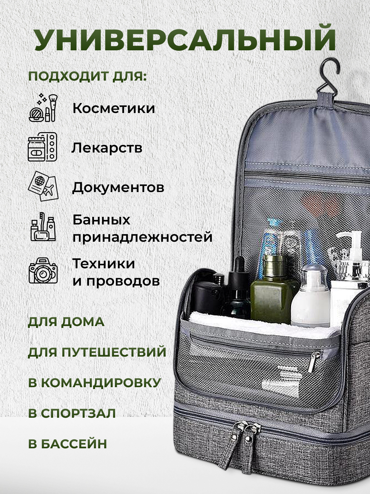 | Дополнительная информация | Дорожный органайзер; косметичка дорожная; косметичка в бассейн; органайзер подвесной с крючком |