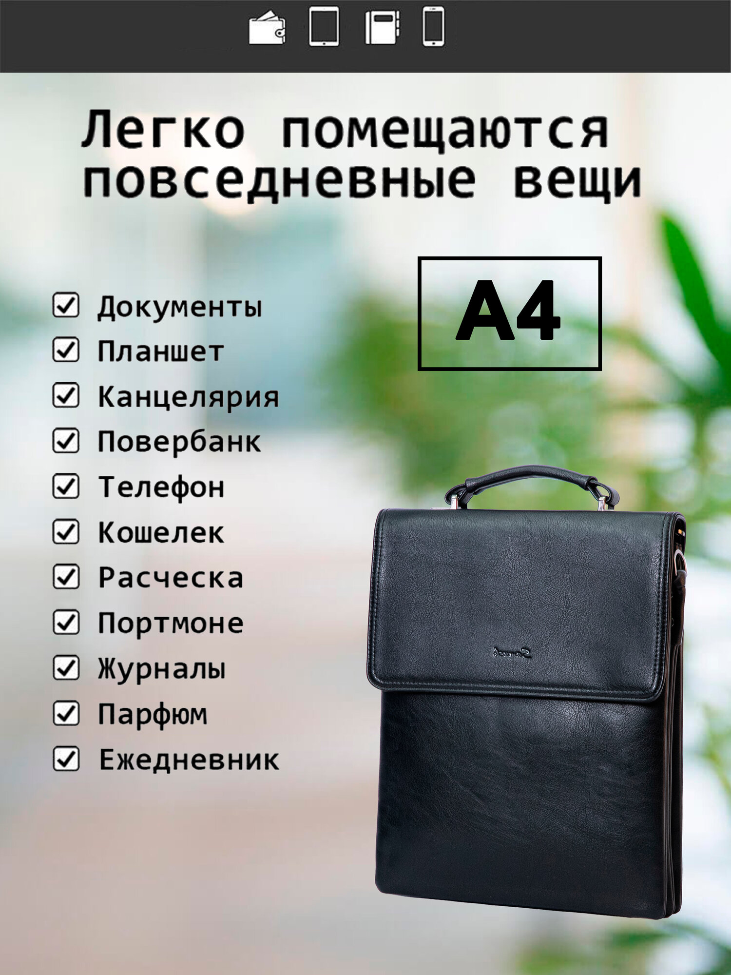 | Особенности модели | верхний клапан, вмещает А4, внешний карман, внутренний карман, водонепроницаемая, крепление для ключей, плечевой ремень |