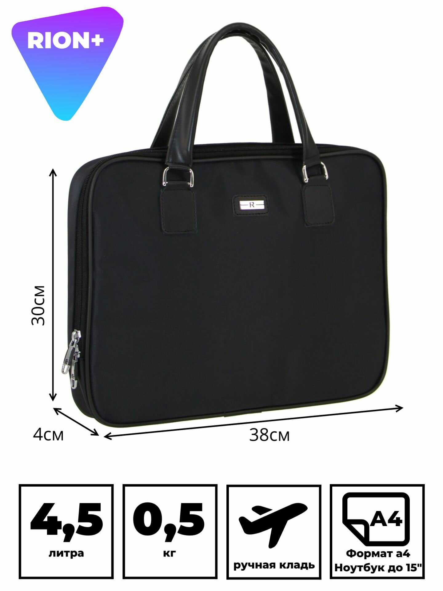 Купить Деловой портфель для документов, бумаг и ноутбука РИОН+ (RION+) R210, A4 формат (ноутбук до 15"), 4-5 литров, на молнии, черный