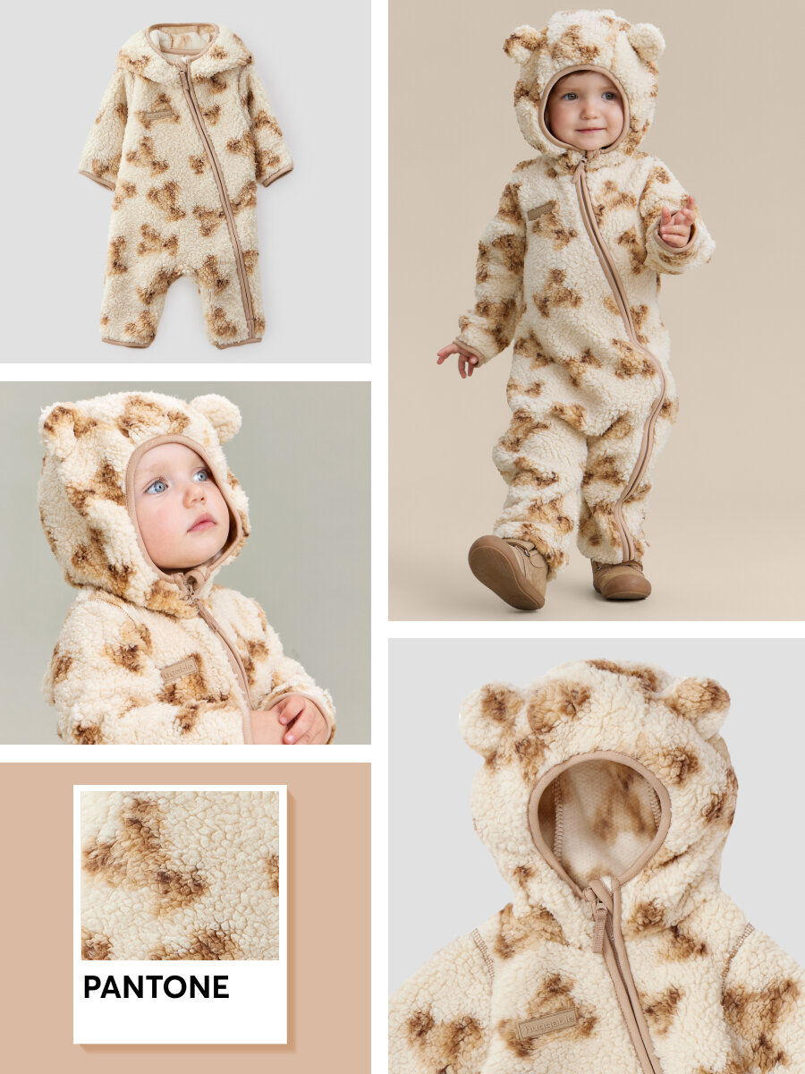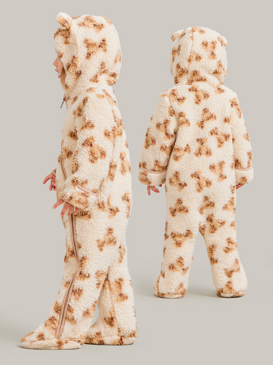 Купить 89055, Комбинезон детский флисовый Happy Baby, для новорожденных, под верхнюю одежду, с капюшоном, с ушками, бежевый с мишками, рост 80-86