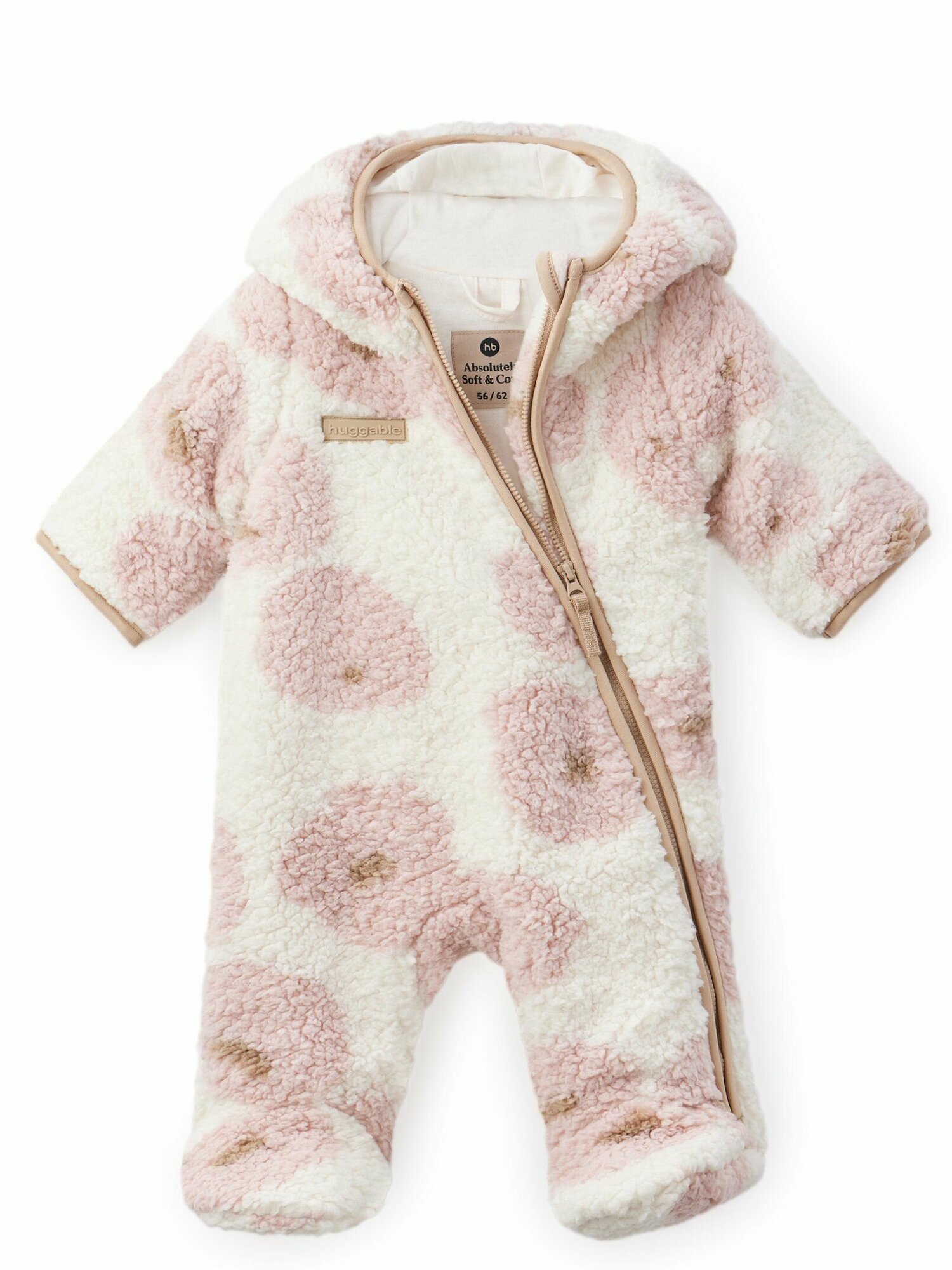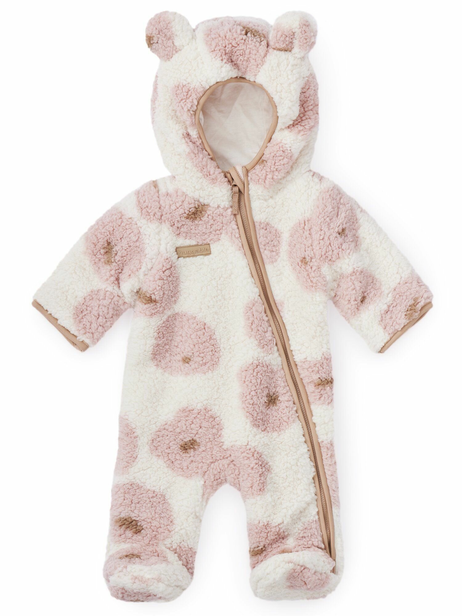 89055, Комбинезон детский флисовый Happy Baby, для новорожденных, под верхнюю одежду, с капюшоном, с ушками, розовый с цветочками, рост 56-62