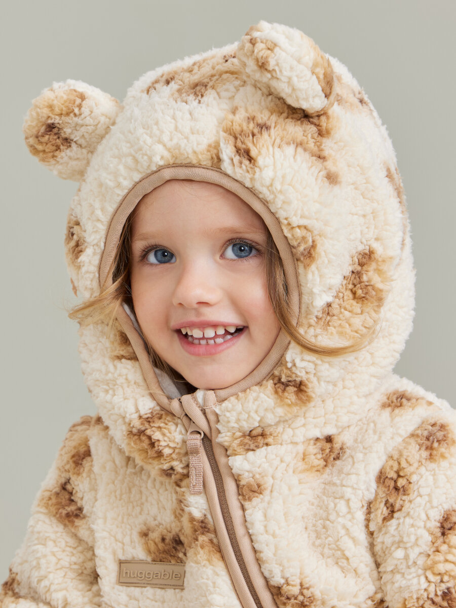 89055, Комбинезон детский флисовый Happy Baby, для новорожденных, под верхнюю одежду, с капюшоном, с ушками, бежевый с мишками, рост 80-86