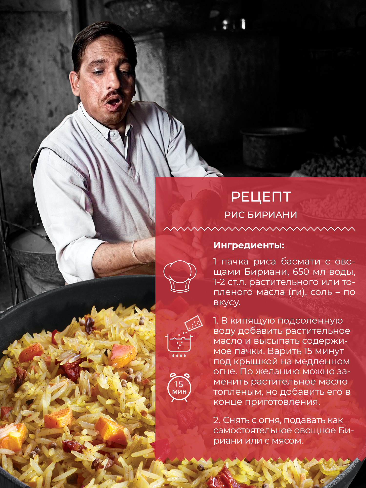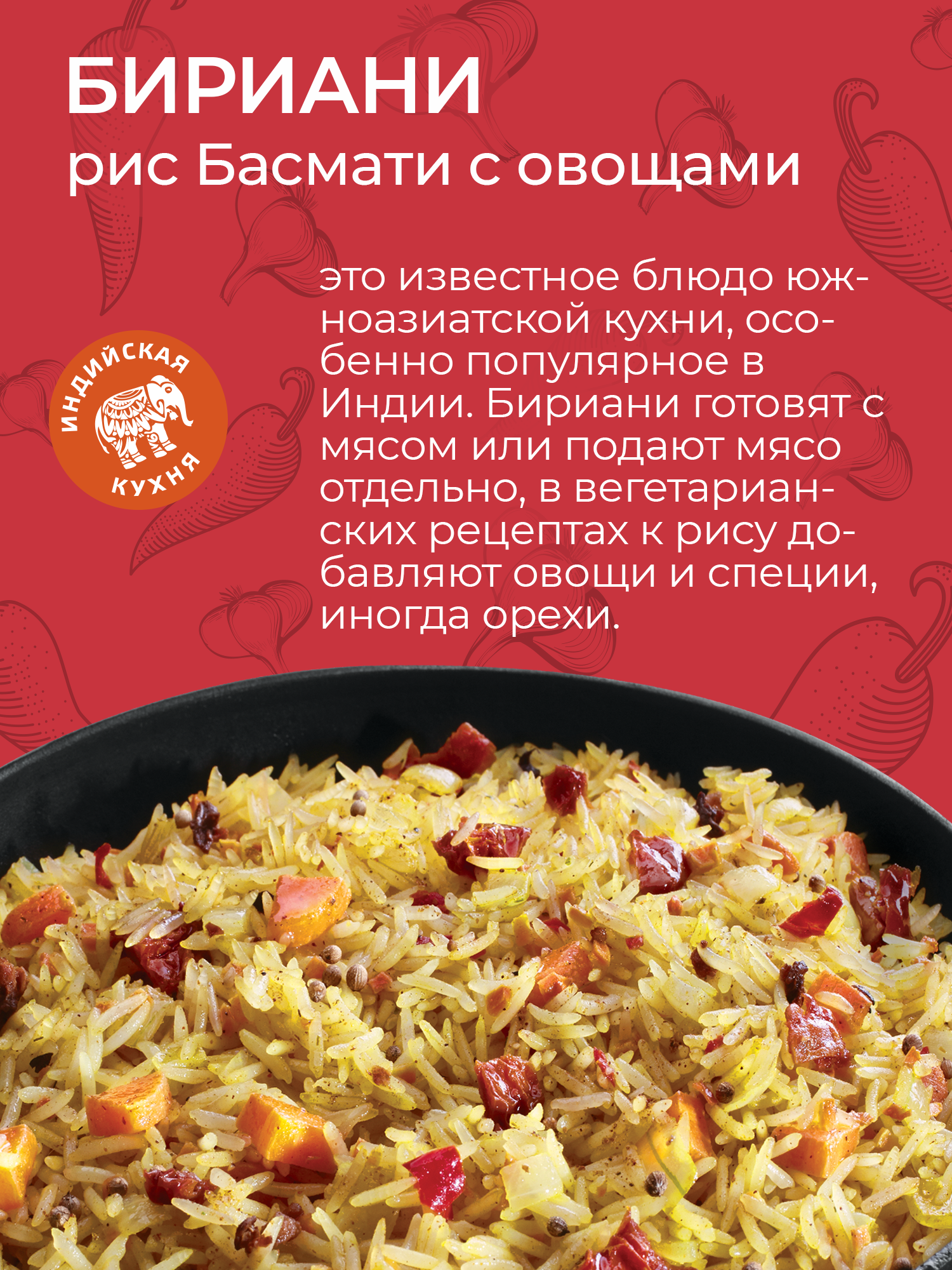 | Состав | рис Басмати, овощи сушеные (морковь, паприка, лук репчатый, томаты, чеснок), специи молотые (куркума, кориандр, перец чили). Продукт может содержать следы глютена, сельдерея, сои, горчицы, арахиса, кунжута, орехов, молока и продуктов его переработки, яиц и продуктов их переработки. |