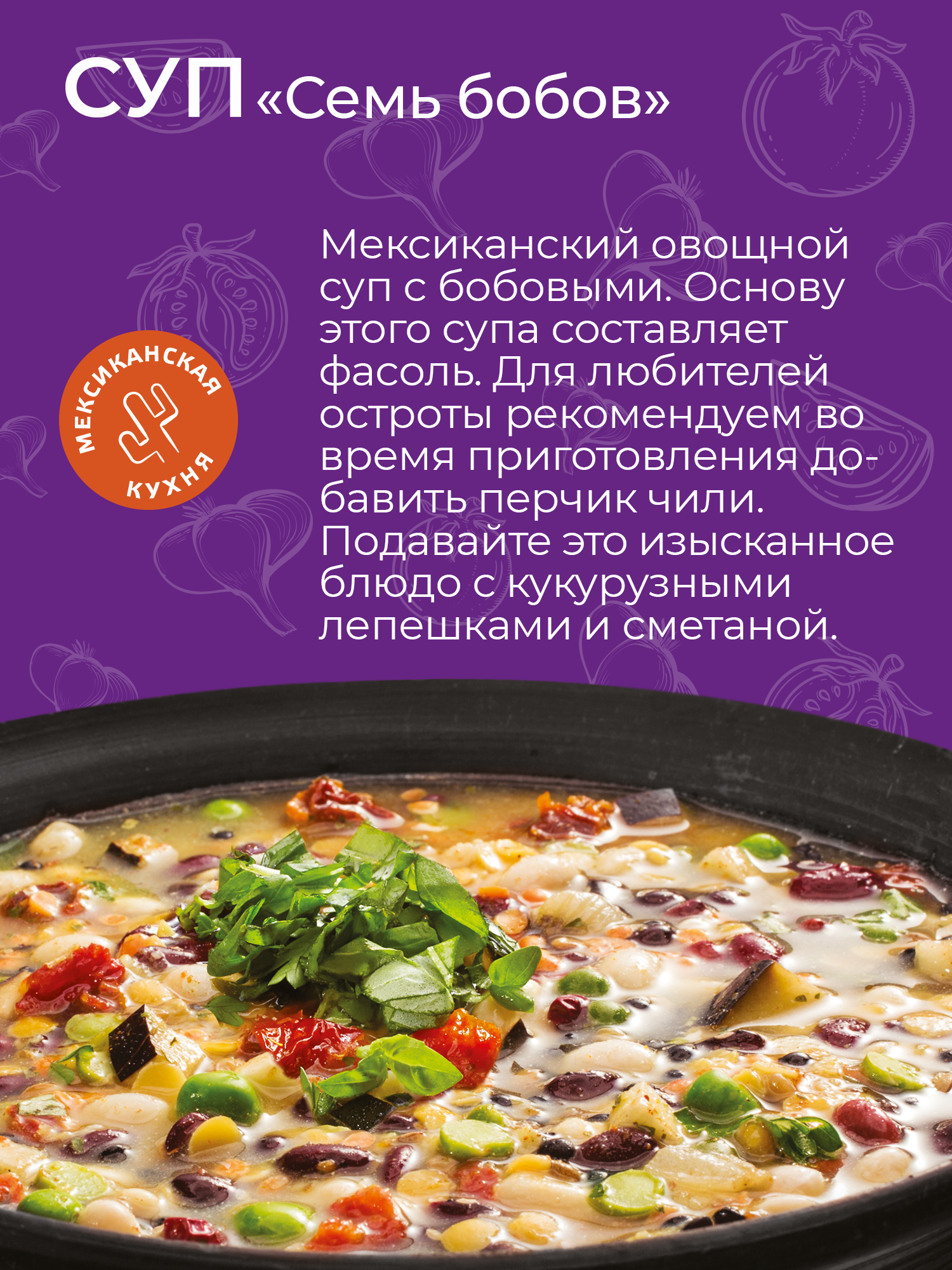 | Состав | фасоль белая, фасоль красная, горох зеленый колотый, чечевица красная, чечевица зеленая целая, овощи сушеные (лук репчатый, томаты, баклажаны, чеснок), чечевица желтая колотая, горох желтый колотый, специи молотые и травы сушеные (петрушка, куркума, кумин, базилик, перец черный). Продукт может содержать следы глютена, сельдерея, сои, горчицы, арахиса, кунжута, орехов, молока и продуктов его переработки, яиц и продуктов их переработки. |