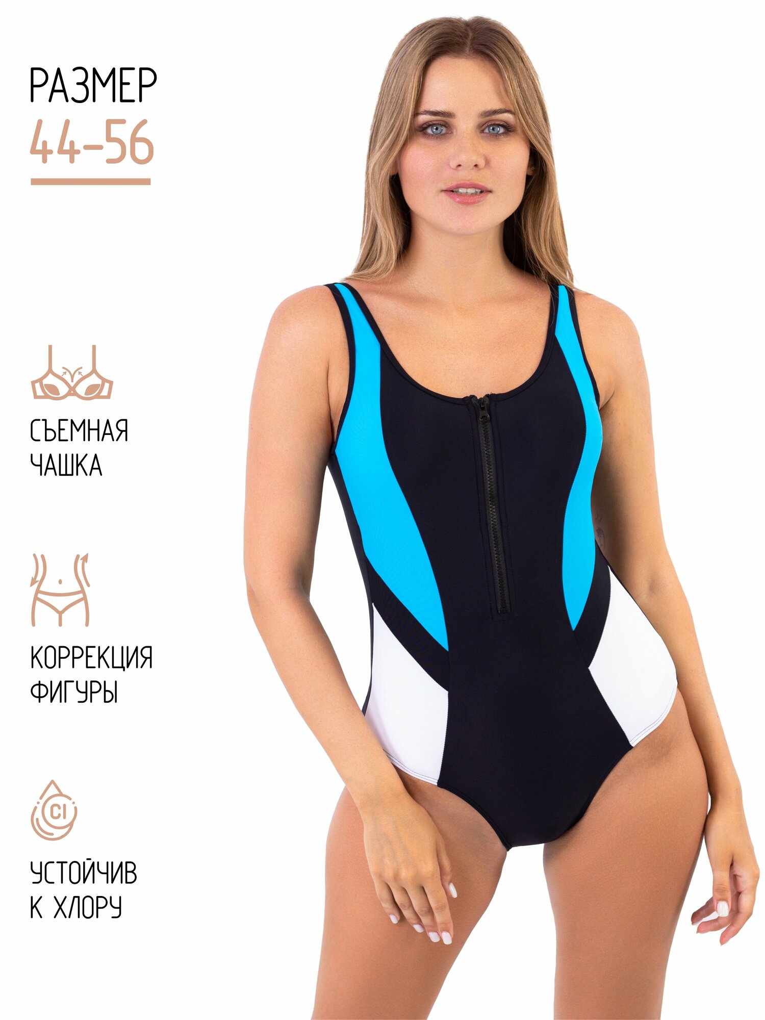 Купальник женский слитный спортивный CSiman на молнии для бассейна и пляжа, утягивающий эффект, большие размеры, черно-голубой, размер 44