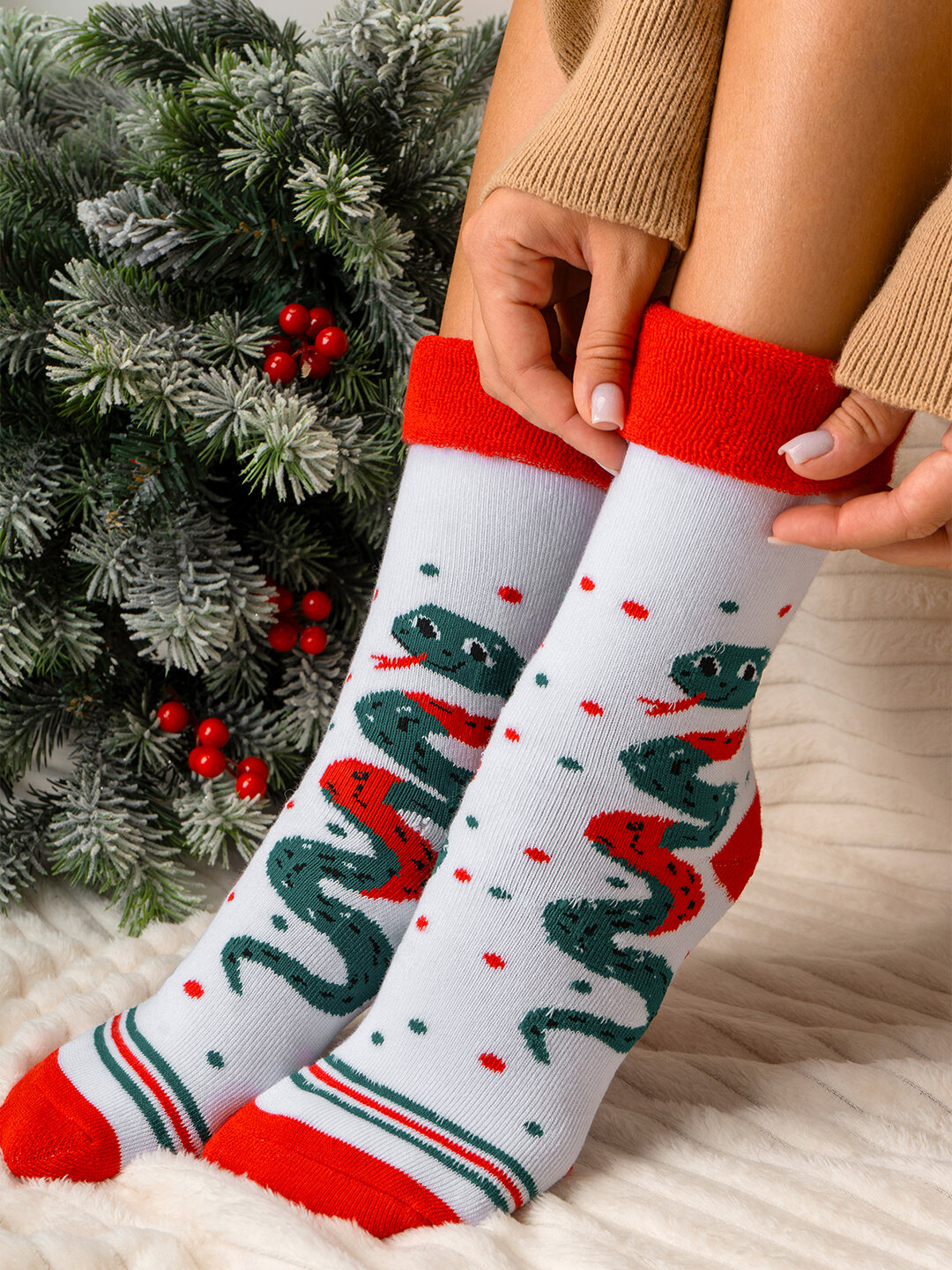 Носки новогодние символ 2025 год Змеи теплые HappyFox HF3125A змейки.молочный 36-40