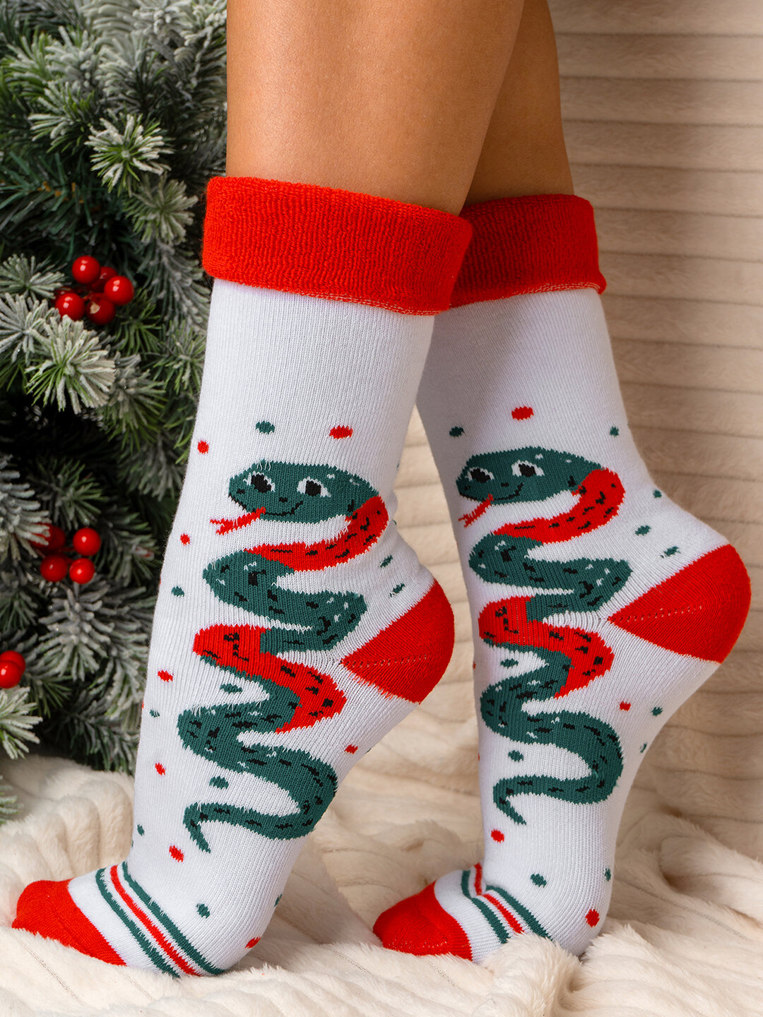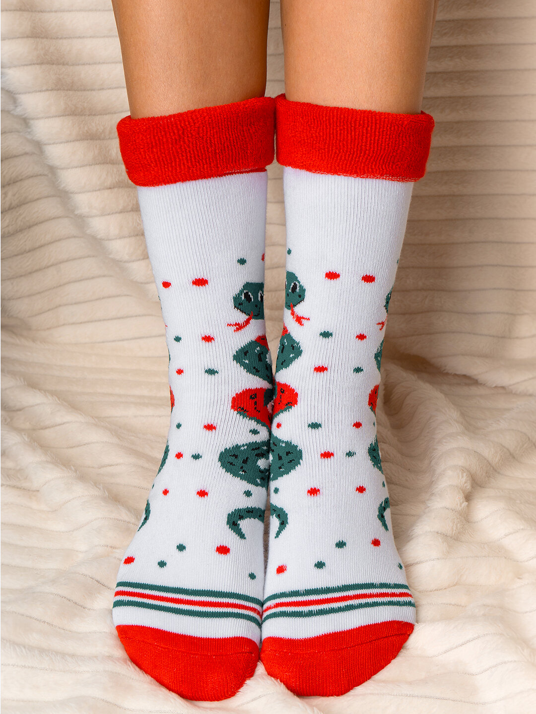 Носки новогодние символ 2025 год Змеи теплые HappyFox HF3125A белый.зеленый 36-40