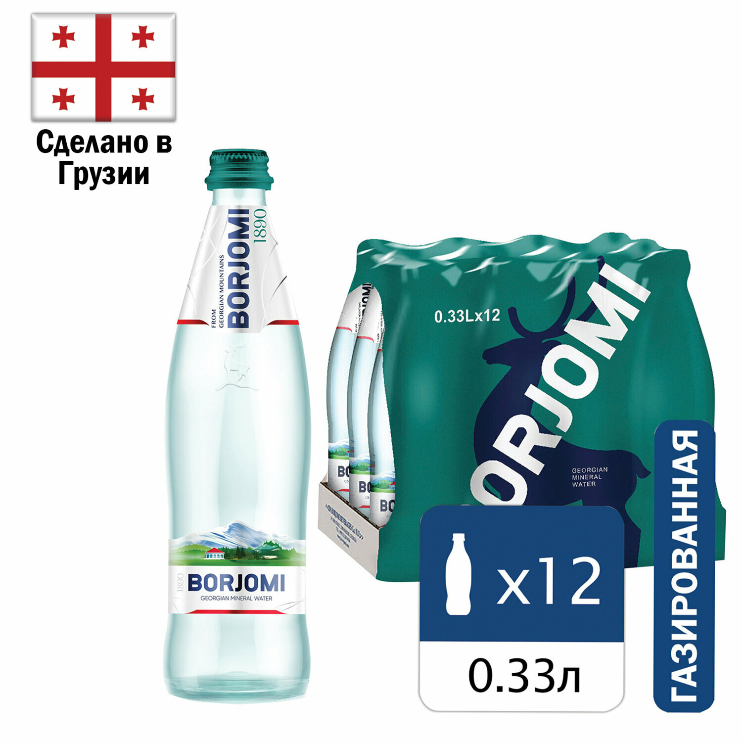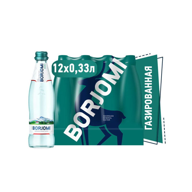 Вода газированная минеральная BORJOMI (боржоми), 0,33 л, стеклянная бутылка - 12 шт.