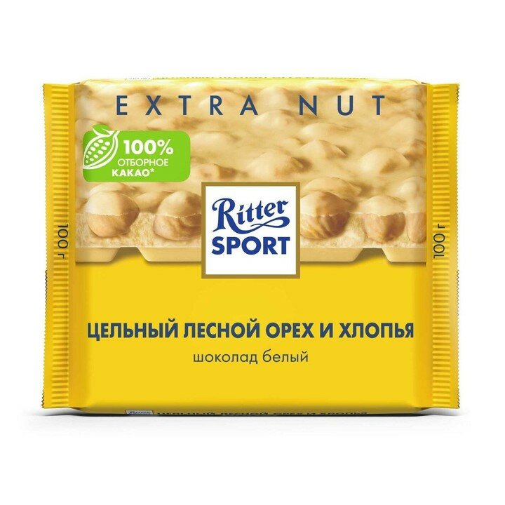 Шоколад RITTER SPORT "Extra Nut", белый с цельным лесным орехом и хлопьями, 100г, Германия, ш/к01008
