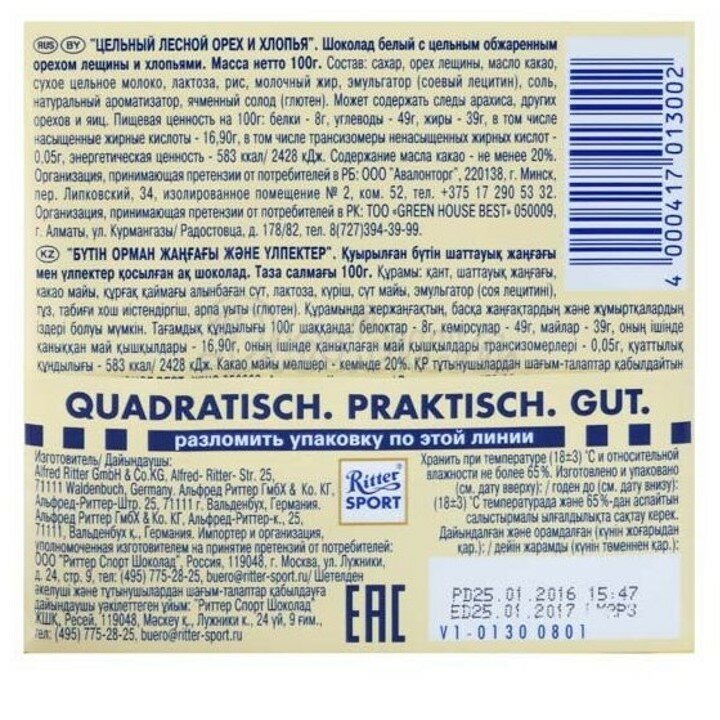 СохранитьШоколад Ritter Sport Риттер белый цельный лесной орех и хлопья, 10 шт по 100 г интересное: