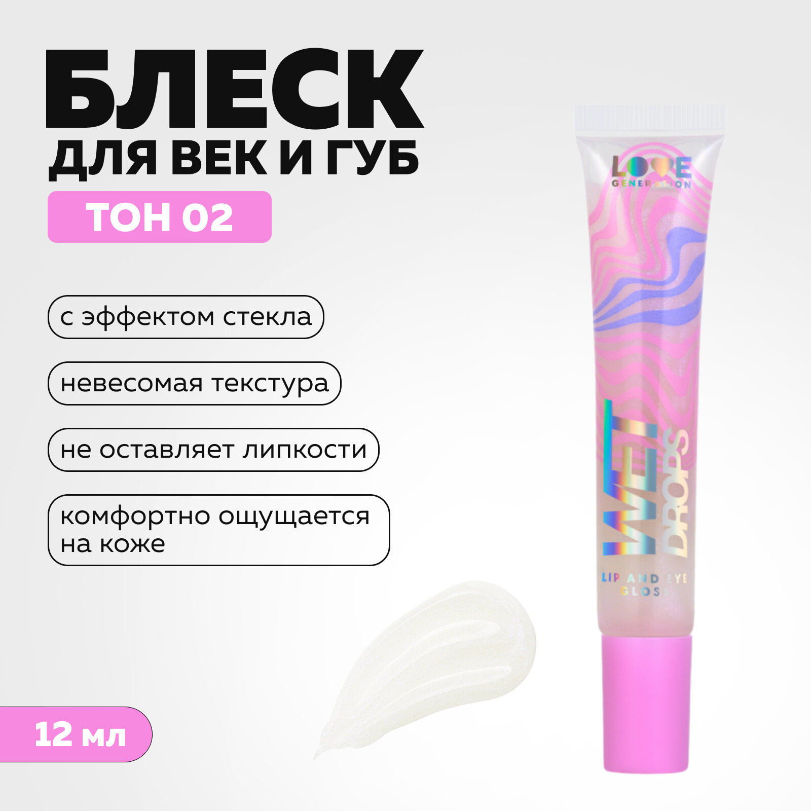Блеск для глаз и губ Love Generation Wet Drops с эффектом жидкого стекла, тон 02, 12 мл