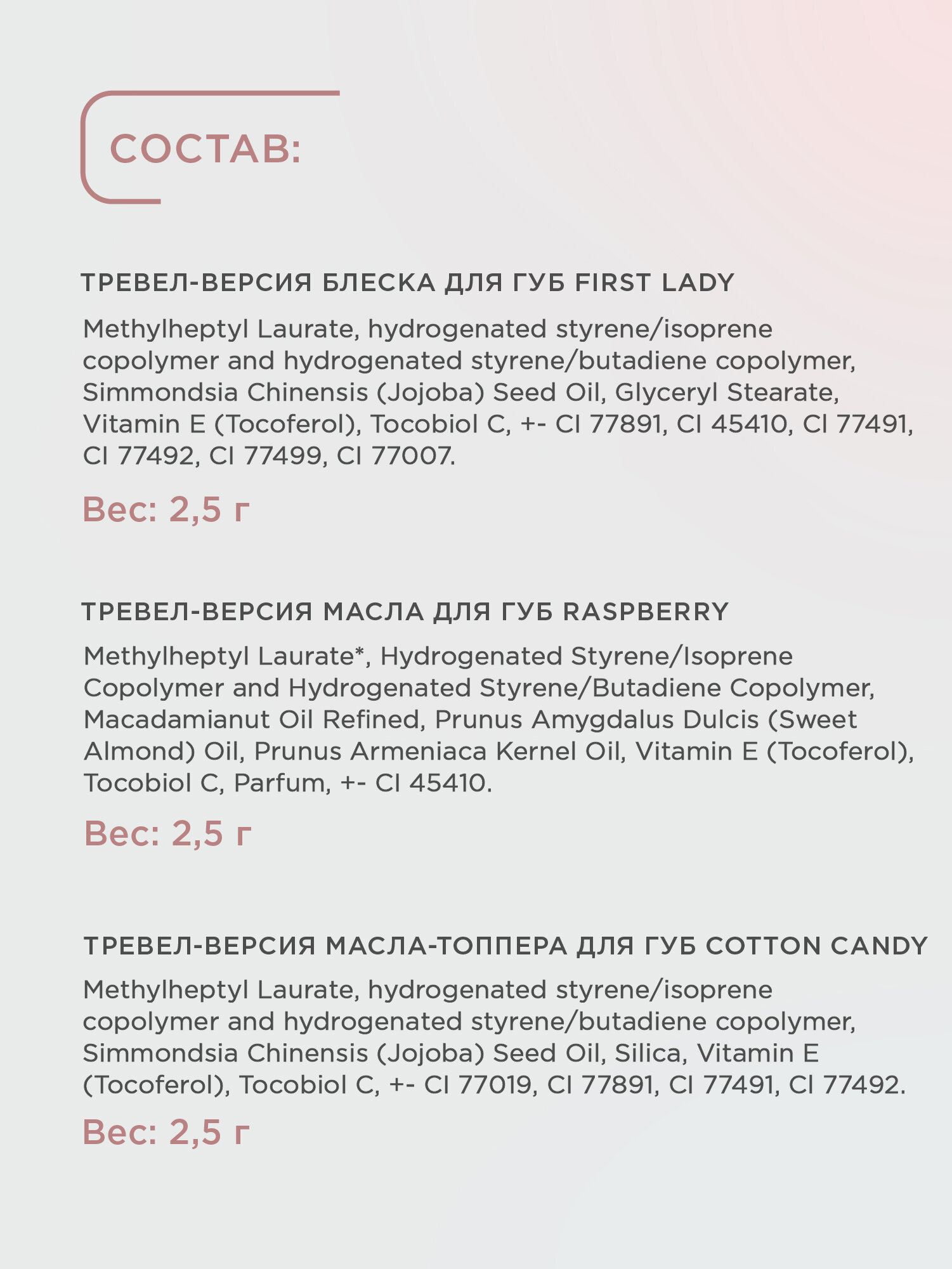| Состав | ✧ Тревел-версия блеска для губ First Lady — 2,5 г INCI: Methylheptyl Laurate, hydrogenated styrene/isoprene copolymer and hydrogenated styrene/butadiene copolymer, Simmondsia Chinensis (Jojoba) Seed Oil, Glyceryl Stearate, Vitamin Е (Tocoferol), Tocobiol C, +- CI 77891, CI 45410, Cl 77491, CI 77492, CI 77499, CI 77007; ✧ Тревел-версия масла для губ Raspberry — 2,5 г INCI: Methylheptyl Laurate*, Hydrogenated Styrene/Isoprene Copolymer and Hydrogenated Styrene/Butadiene Copolymer, Macadamianut Oil Refined, Prunus Amygdalus Dulcis (Sweet Almond) Oil, Prunus Armeniaca Kernel Oil, Vitamin Е (Tocoferol), Tocobiol C, Parfum, +- CI 45410; ✧ Тревел-версия масла-топпера для губ Cotton Candy — 2,5 г INCI: Methylheptyl Laurate, hydrogenated styrene/isoprene copolymer and hydrogenated styrene/butadiene copolymer, Simmondsia Chinensis (Jojoba) Seed Oil, Silica, Vitamin Е (Tocoferol), Tocobiol C, +- CI 77019, CI 77891, CI 77491, Cl 77492. |
