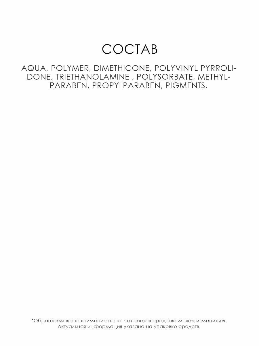 | Состав | aqua, polymer, dimethicone, polyvinyl pyrrolidone, triethanolamine , polysorbate, methylparaben, propylparaben, pigments |