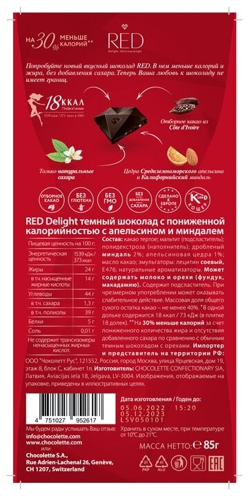 Ниже Вы можете прочитать отзывы на RED Delight Темный Апельсин и Миндаль со сниженной калорийностью, 0.085 кг, ознакомится с подробными характеристиками, посмотреть интересные обзоры и фотографии на RED Delight Темный Апельсин и Миндаль со сниженной калорийностью, 0.085 кг.