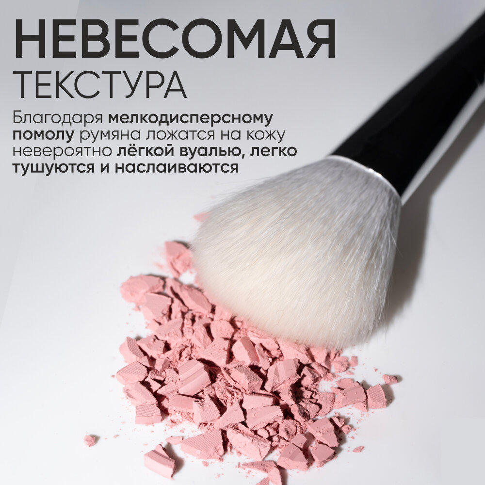 | Способ применения | при помощи кисти с натуральным ворсом нанесите румяна на яблочки щёк, растушуйте |