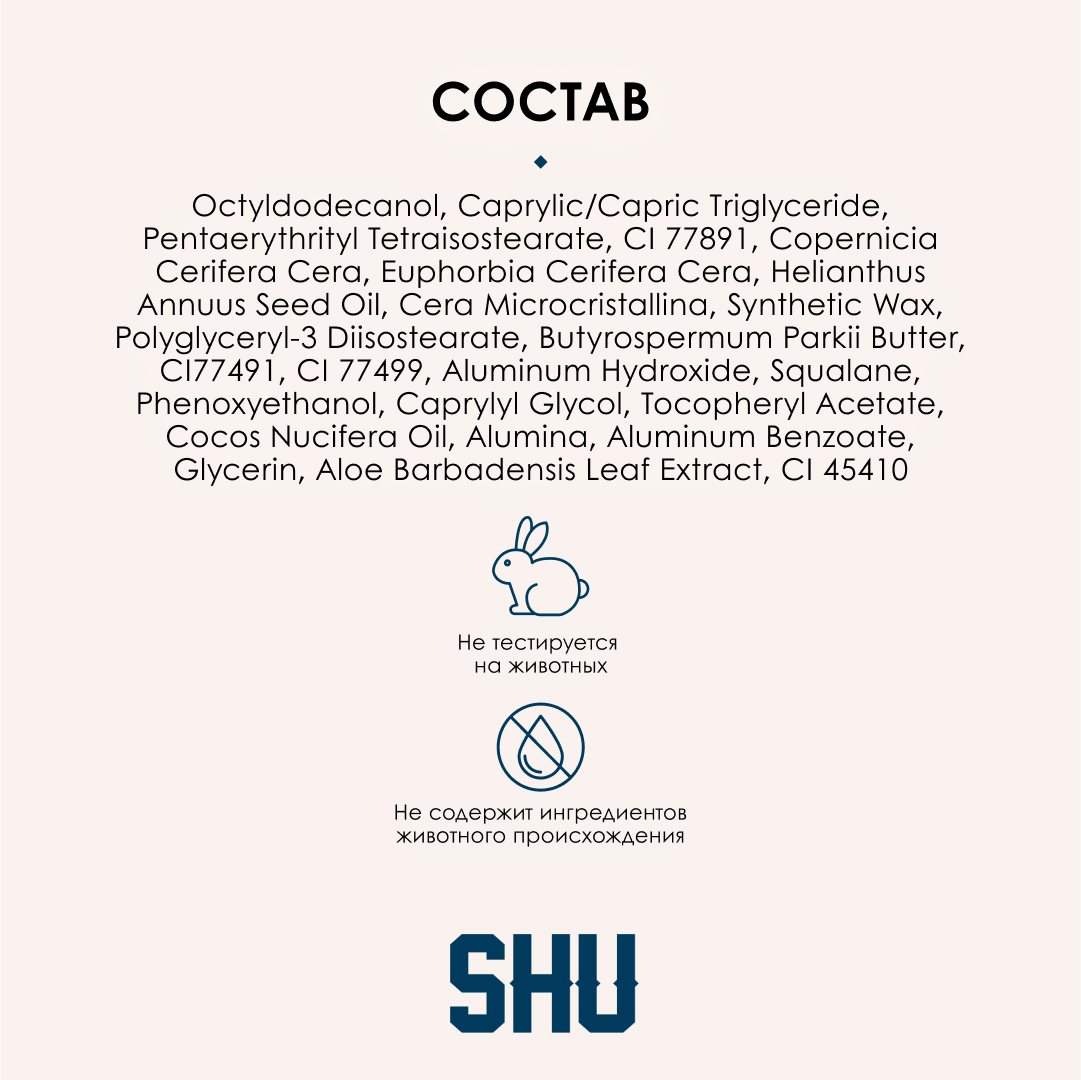 | Состав | Octyldodecanol, Caprylic/Capric Triglyceride, Pentaerythrityl Tetraisostearate, CI 77891, Copernicia Cerifera Cera, Euphorbia Cerifera Cera, Helianthus Annuus Seed Oil, Cera Microcristallina, Synthetic Wax, Polyglyceryl-3 Diisostearate, Butyrospermum Parkii Butter, CI 77491, Aluminum Hydroxide, Squalane, Phenoxyethanol, Caprylyl Glycol, Tocopheryl Acetate, Cocos Nucifera Oil, Alumina, Glycerin, Aloe Barbadensis Leaf Extract, CI 77499, CI 73360. |