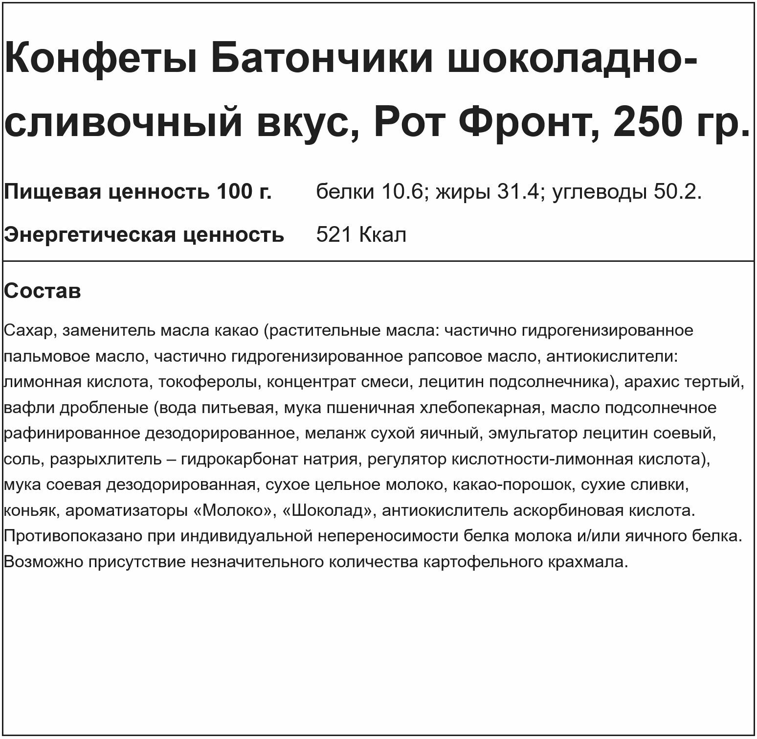 Ниже Вы можете прочитать отзывы на Конфеты Батончики шоколадно-сливочный вкус, Рот Фронт, 250 гр., ознакомится с подробными характеристиками, посмотреть интересные обзоры и фотографии на Конфеты Батончики шоколадно-сливочный вкус, Рот Фронт, 250 гр..