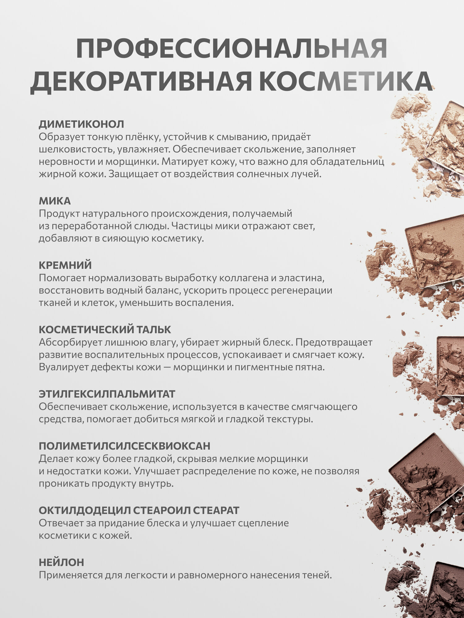 | Состав | диметиконол;тальк;мика;кремний;этилгексилпальмитат;полиметилсилсесквиоксан;октилдодецил стеароил стеарат;магния стеарат;нейлон;слюда синтетическая |