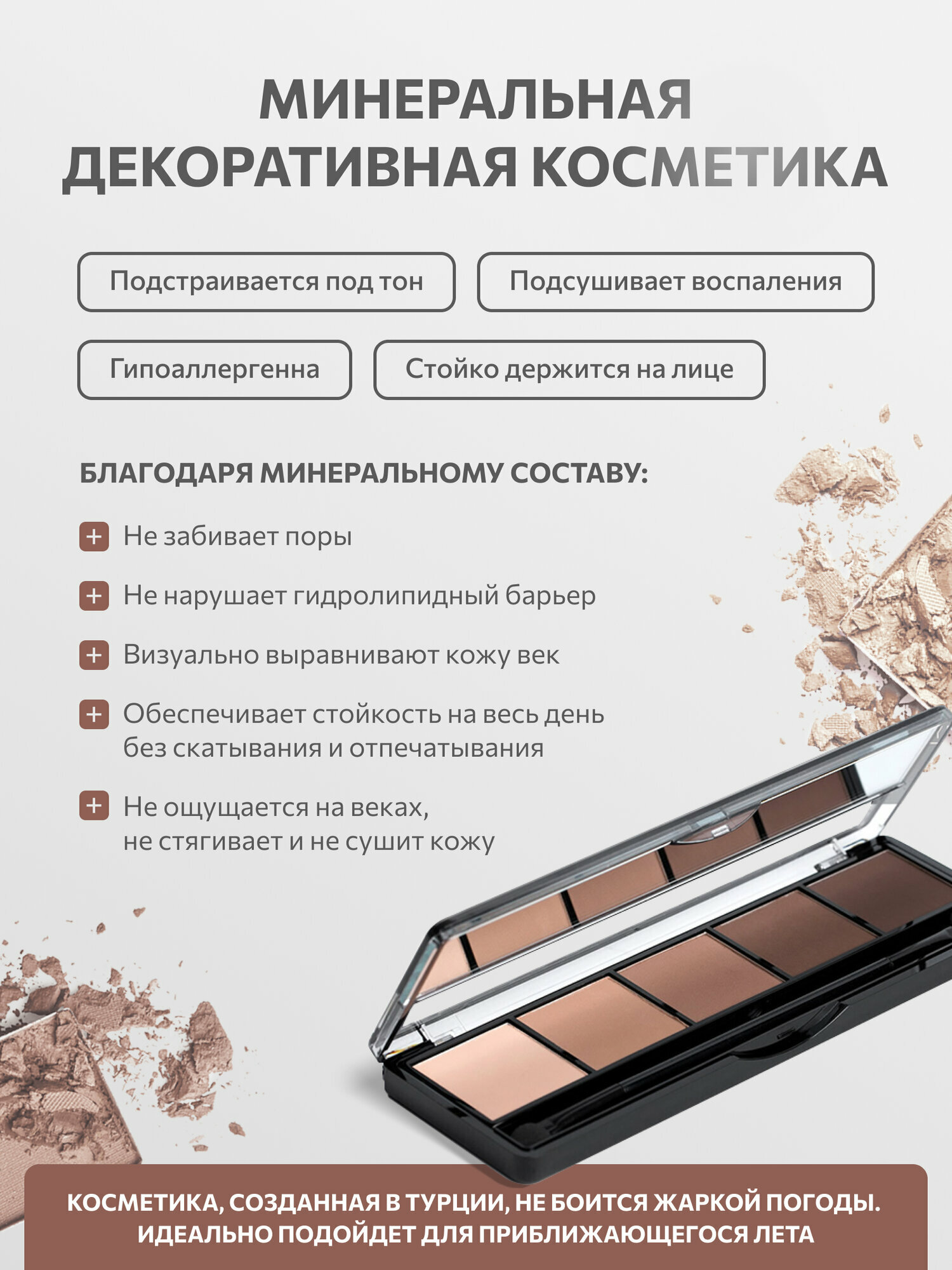 | Особенности | аппликатор в комплекте / гипоаллергенные / запеченные / минеральные / не тестируются на животных / протестированы дерматологически |