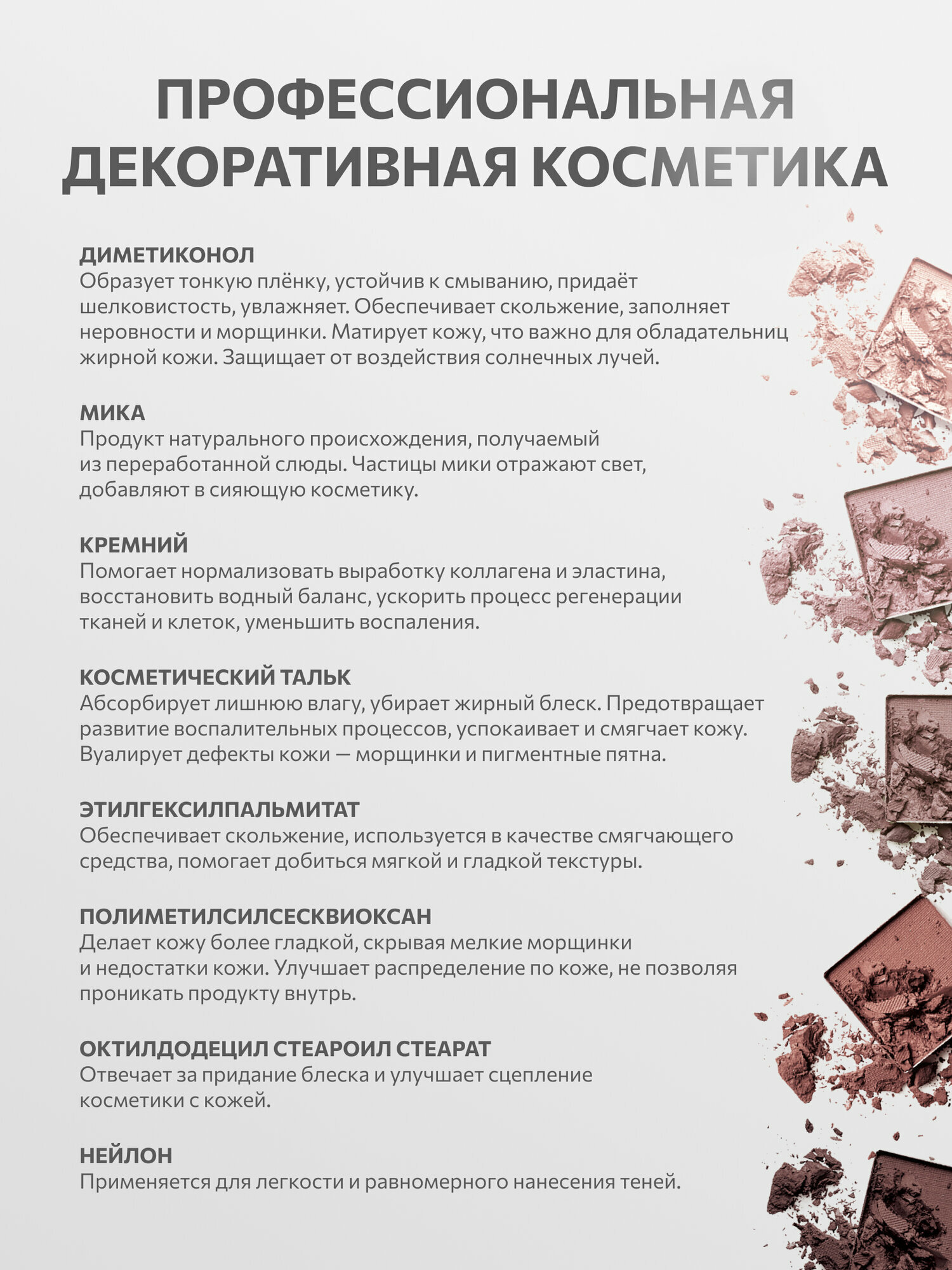 | Состав | диметиконол;тальк;мика;кремний;этилгексилпальмитат;полиметилсилсесквиоксан;октилдодецил стеароил стеарат;магния стеарат;нейлон;слюда синтетическая |