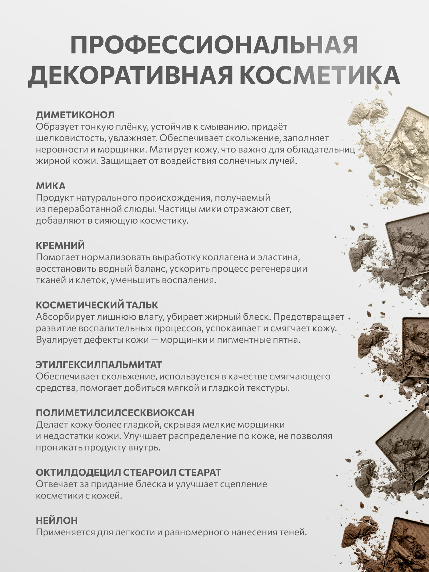 | Состав | диметиконол;тальк;мика;кремний;этилгексилпальмитат;полиметилсилсесквиоксан;октилдодецил стеароил стеарат;магния стеарат;нейлон;слюда синтетическая |