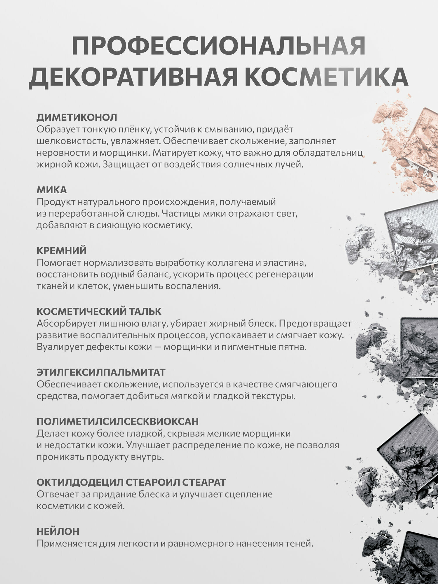 | Состав | диметиконол;тальк;мика;кремний;этилгексилпальмитат;полиметилсилсесквиоксан;октилдодецил стеароил стеарат;магния стеарат;нейлон;слюда синтетическая |