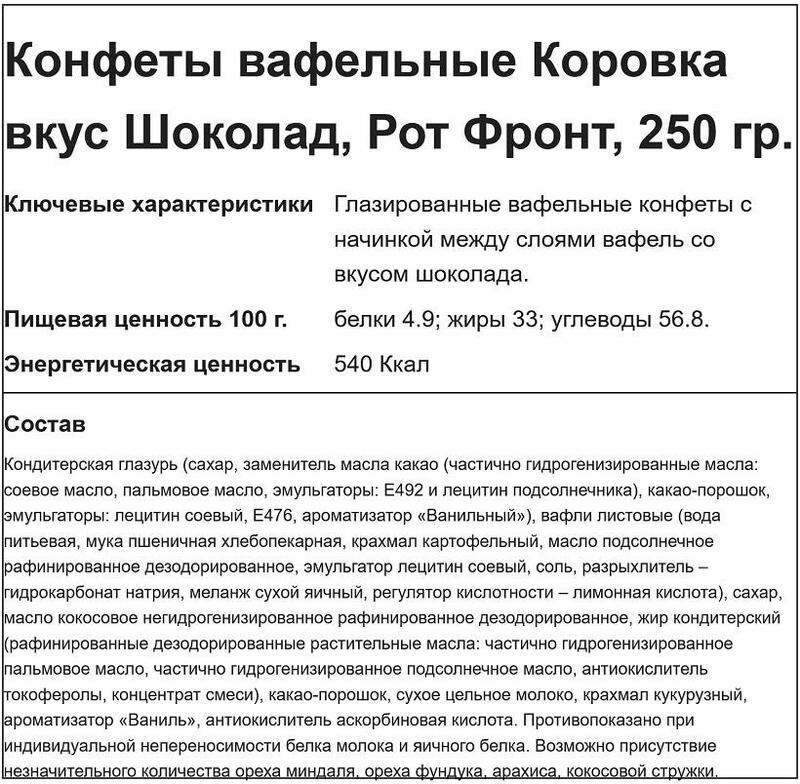 Ниже Вы можете прочитать отзывы на Конфеты вафельные Коровка вкус Шоколад, Рот Фронт, 250 гр., ознакомится с подробными характеристиками, посмотреть интересные обзоры и фотографии на Конфеты вафельные Коровка вкус Шоколад, Рот Фронт, 250 гр..