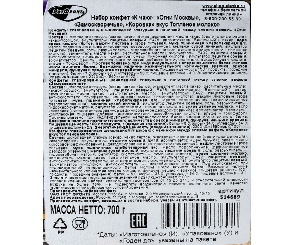 Ниже Вы можете прочитать отзывы на Набор конфет Рот Фронт Огни Москвы, Замоскворечье, Коровка топл.мол., 700г, ознакомится с подробными характеристиками, посмотреть интересные обзоры и фотографии на Набор конфет Рот Фронт Огни Москвы, Замоскворечье, Коровка топл.мол., 700г.