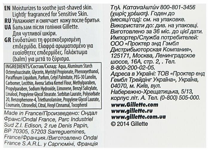 | Дополнительная информация | Завершите бритье бальзом после бритья Gillette Sensitive Skin, равномерно нанеся бальзам на лицо и кожу после бритья. Подходит для частого использования. |