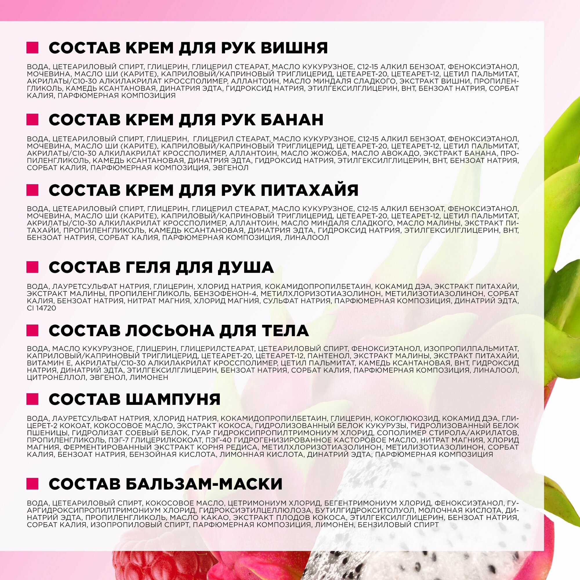 | Состав | 1. Super Food Dragon Fruit Shower gel - Гель для душа «Драконий фрукт»: Вода / лауретсульфат натрия / глицерин / Хлорид Натрия / кокамидопропилбетаин / кокамид ДЭА / экстракт питахайи / экстракт малины / пропиленгликоль / бензофенон-4 / Метилхлоризотиазолинон / Метилизотиазолинон / сорбат калия / бензоат натрия / нитрат магния / хлорид магния / сульфат натрия / парфюмерная композиция / динатрий ЭДТА / CI 14720. 2. Super Food Dragon Fruit Lotion - Лосьон для тела «Драконий фрукт»: Вода / масло кукурузное / глицерин / глицерилстеарат / цетеариловый спирт / феноксиэтанол / изопропилпальмитат / каприловый/каприновый триглицерид / цетеарет-20 / цетеарет-12 / пантенол / экстракт малины / экстракт питахайи / витамин Е / акрилаты/С10-30 алкилакрилат кроссполимер / цетил пальмитат / камедь ксантановая / BHT / гидроксид натрия / динатрий ЭДТА / этилгексилглицерин / бензоат натрия / сорбат калия / парфюмерная композиция / линалоол / цитронеллол / эвгенол / лимонен. 3. Super Food Cherry and Almond Hand Cream - Крем для рук «Вишня»: Вода / цетеариловый спирт / глицерин / глицерил стеарат / масло кукурузное / C12-15 алкил бензоат / феноксиэтанол / мочевина / масло ши (карите) / каприловый/каприновый триглицерид / цетеарет-20 / цетеарет-12 / цетил пальмитат / акрилаты/С10-30 алкилакрилат кроссполимер / аллантоин / масло миндаля сладкого / экстракт вишни / пропиленгликоль / камедь ксантановая / Динатрия ЭДТА / гидроксид натрия / этилгексилглицерин / BHT / бензоат натрия / сорбат калия / парфюмерная композиция. 4. Super Food Banana Hand Cream - Крем для рук «Банан»: Вода / цетеариловый спирт / глицерин / глицерил стеарат / масло кукурузное / C12-15 алкил бензоат / феноксиэтанол / мочевина / масло ши (карите) / каприловый/каприновый триглицерид / цетеарет-20 / цетеарет-12 / цетил пальмитат / акрилаты/С10-30 алкилакрилат кроссполимер / аллантоин / масло жожоба / Масло Авокадо / Экстракт Банана / пропиленгликоль / камедь ксантановая / Динатрия ЭДТА / гидроксид натрия / этилгексилглицерин / BHT / бензоат натрия / сорбат калия / парфюмерная композиция / эвгенол. 5. Super Food Dragon Fruit Hand Cream - Крем для рук «Драконий фрукт»: Вода / цетеариловый спирт / глицерин / глицерил стеарат / масло кукурузное / C12-15 алкил бензоат / феноксиэтанол / мочевина / масло ши (карите) / каприловый/каприновый триглицерид / цетеарет-20 / цетеарет-12 / цетил пальмитат / акрилаты/С10-30 алкилакрилат кроссполимер / аллантоин / масло миндаля сладкого / масло малины / экстракт питахайи / пропиленгликоль / камедь ксантановая / Динатрия ЭДТА / гидроксид натрия / этилгексилглицерин / BHT / бензоат натрия / сорбат калия / парфюмерная композиция / линалоол. 6. Super Food Coconut Revitalizing Shampoo - Восстанавливающий шампунь для волос "Кокос": Вода / лауретсульфат натрия / Хлорид Натрия / кокамидопропилбетаин / глицерин / кокоглюкозид / кокамид ДЭА / глицерет-2 кокоат / Кокосовое Масло / экстракт кокоса / гидролизованный белок кукурузы / гидролизованный белок пшеницы / гидролизат соевый белок / гуар гидроксипропилтримониум хлорид / сополимер стирола/акрилатов / пропиленгликоль / ПЭГ-7 глицерилкокоат / ПЭГ-40 |